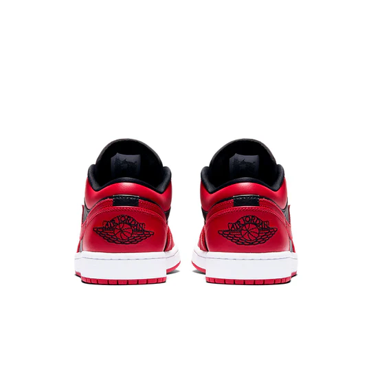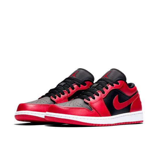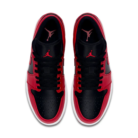 Nike Air Jordan 1 Low “Reverse Bred” dressed in a Red, Black color scheme. This Air Jordan 1 low features a Black leather base with red leather overlays and Swooshes. Finishing touches includes black Air Jordan logo on the heel atop a white midsole and red rubber outsole.