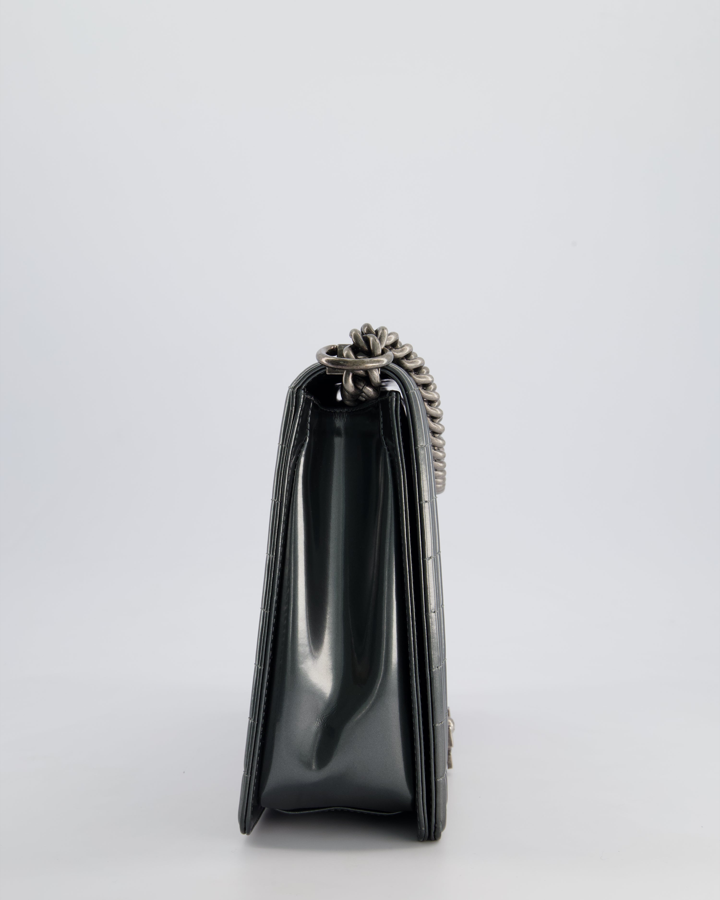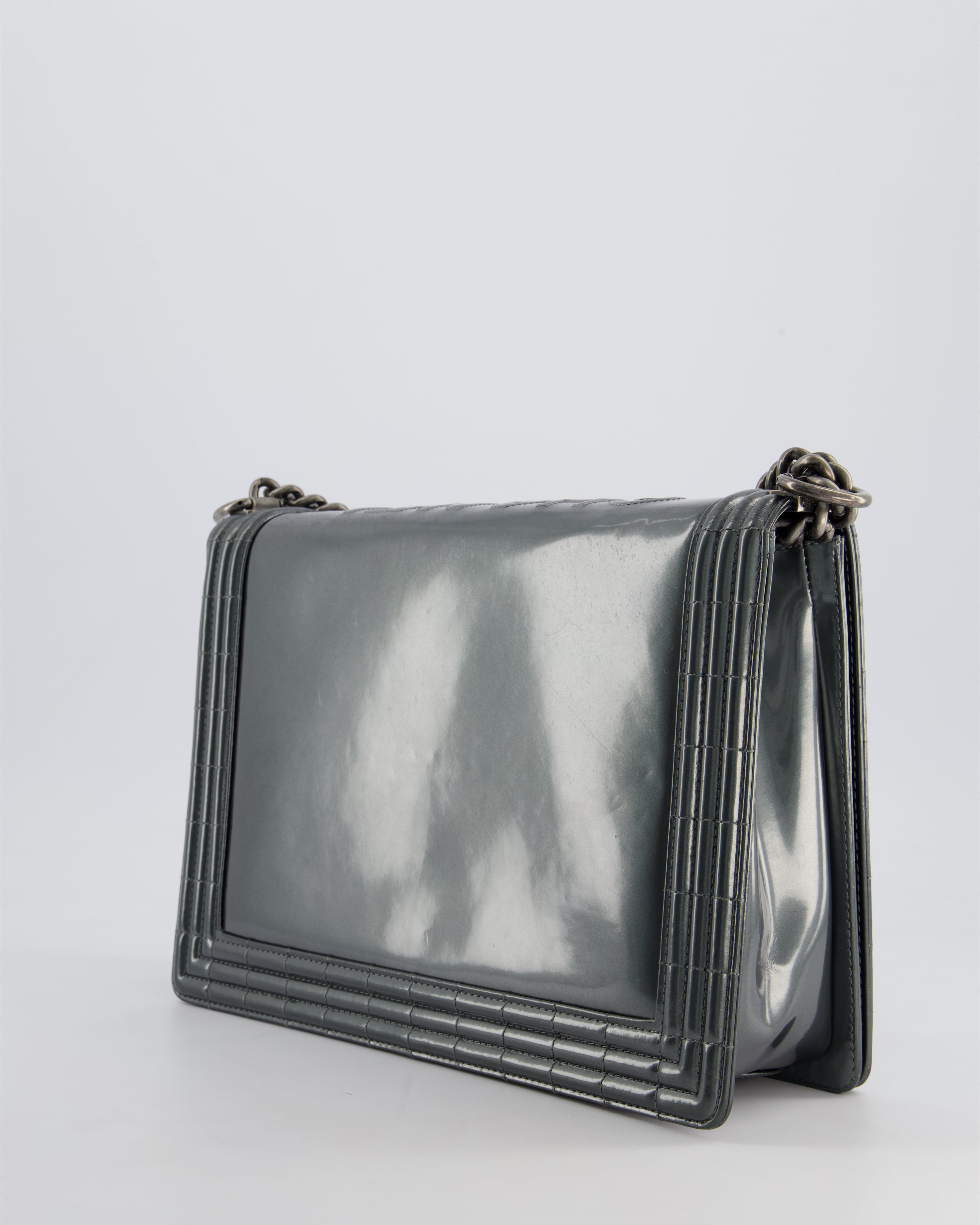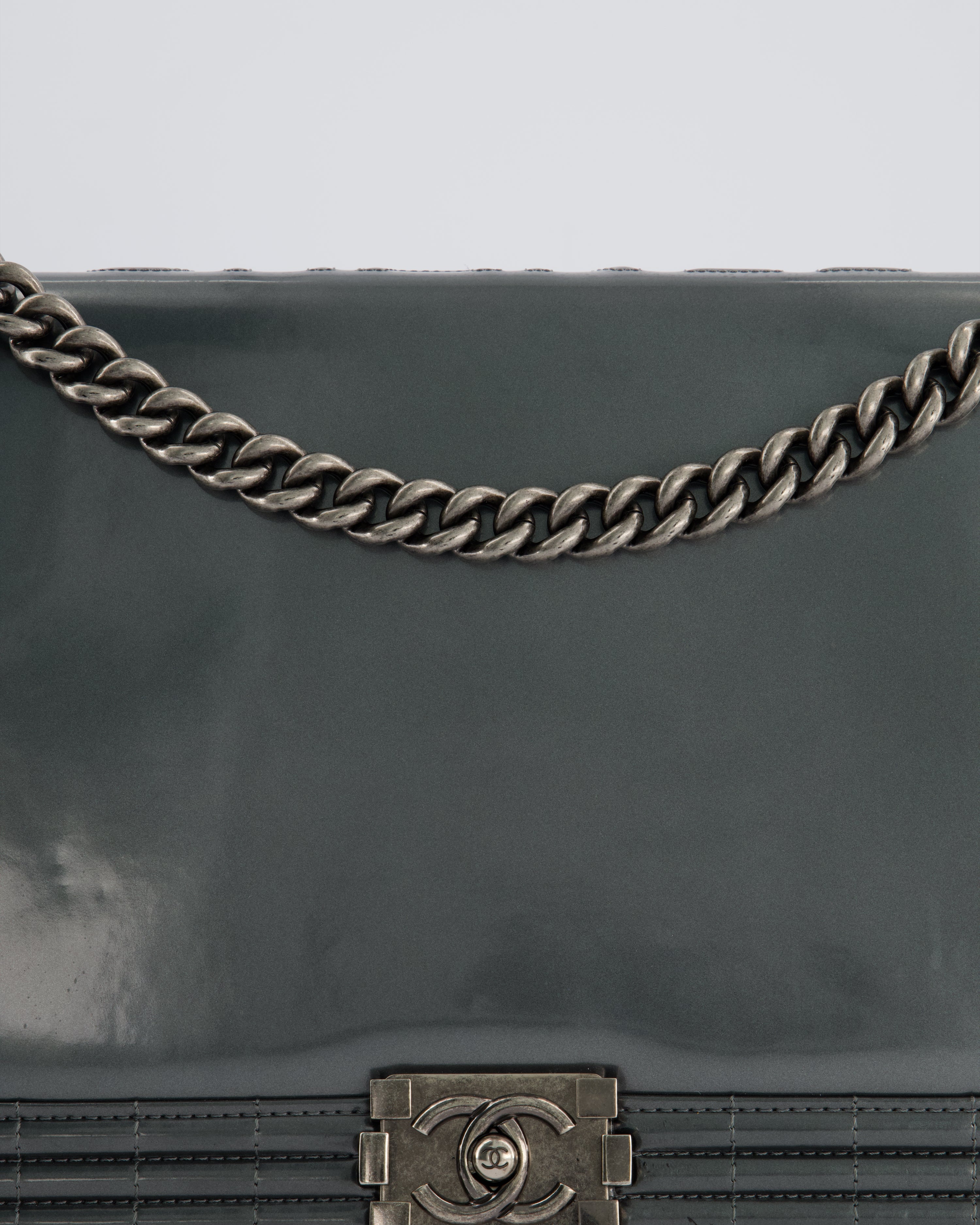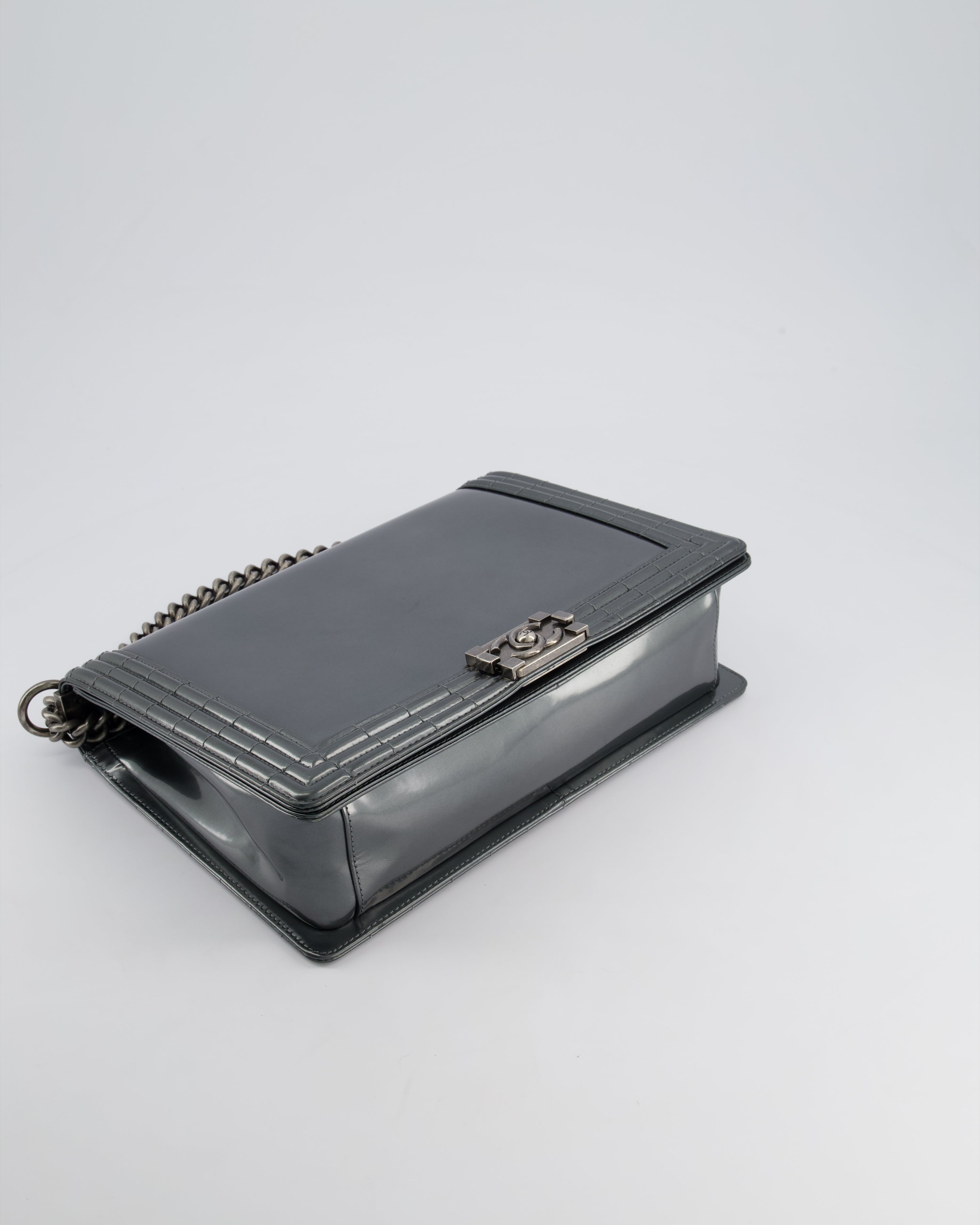 Chanel Large Dark Grey Boy Bag in Patent Leather with Ruthenium Hardware