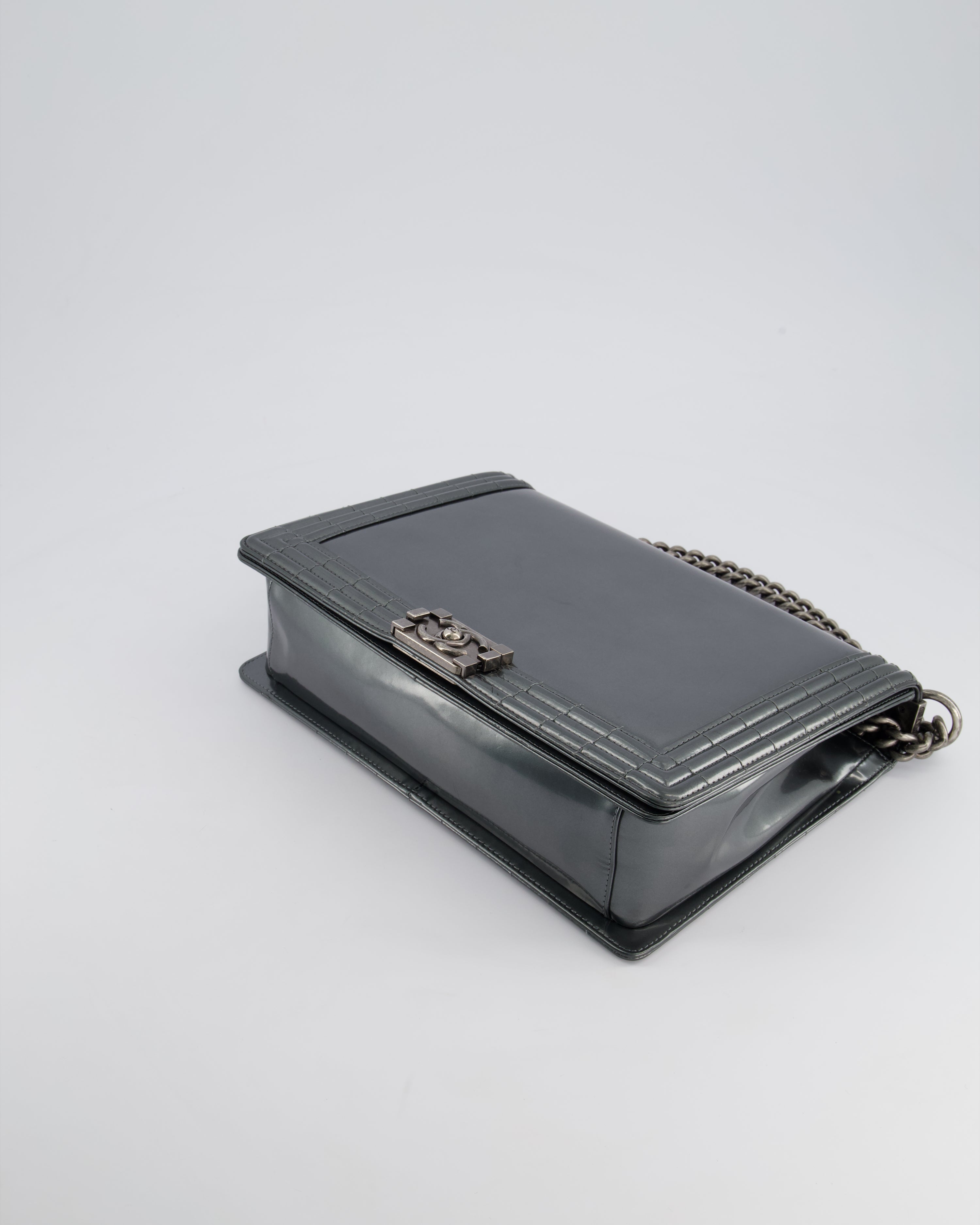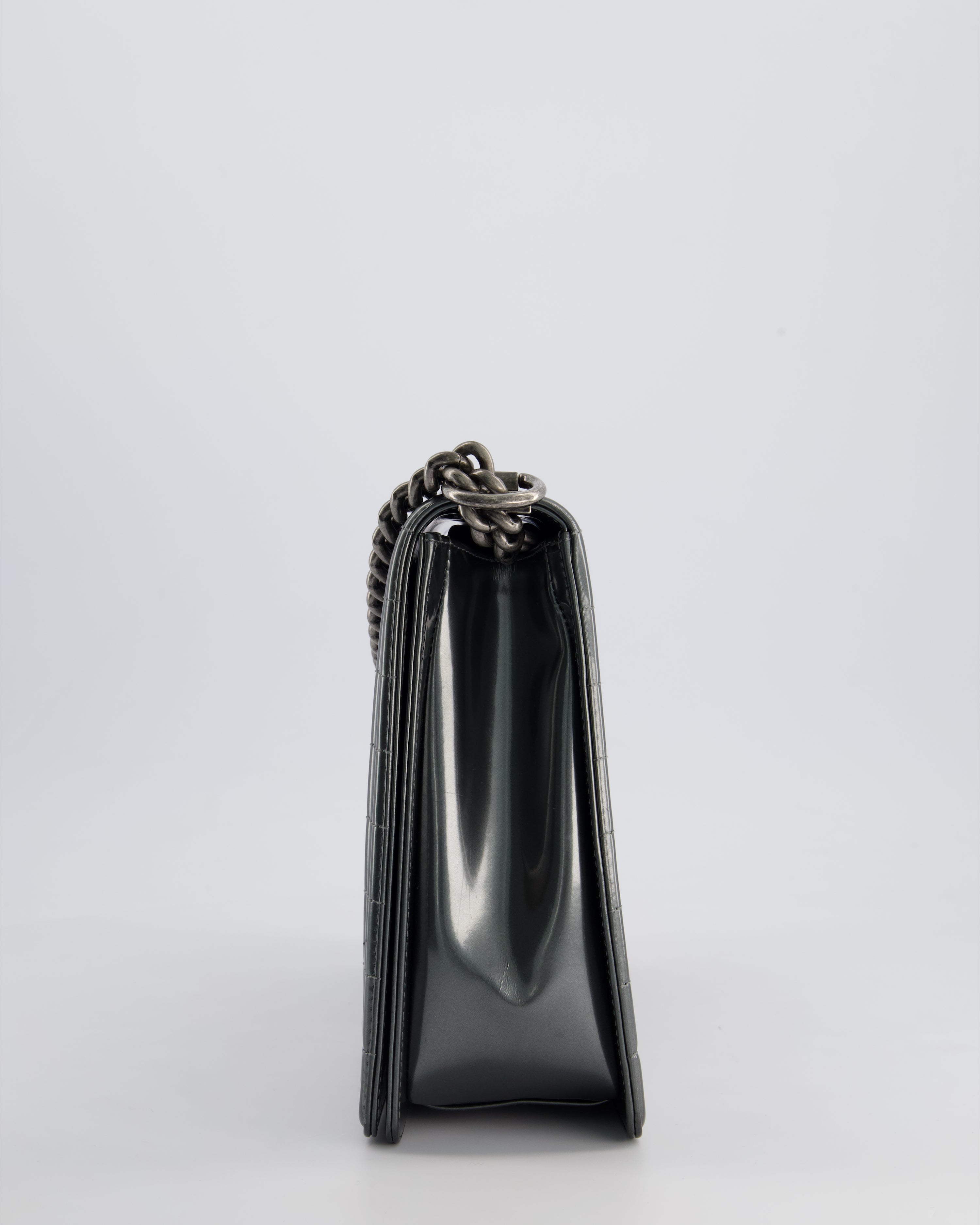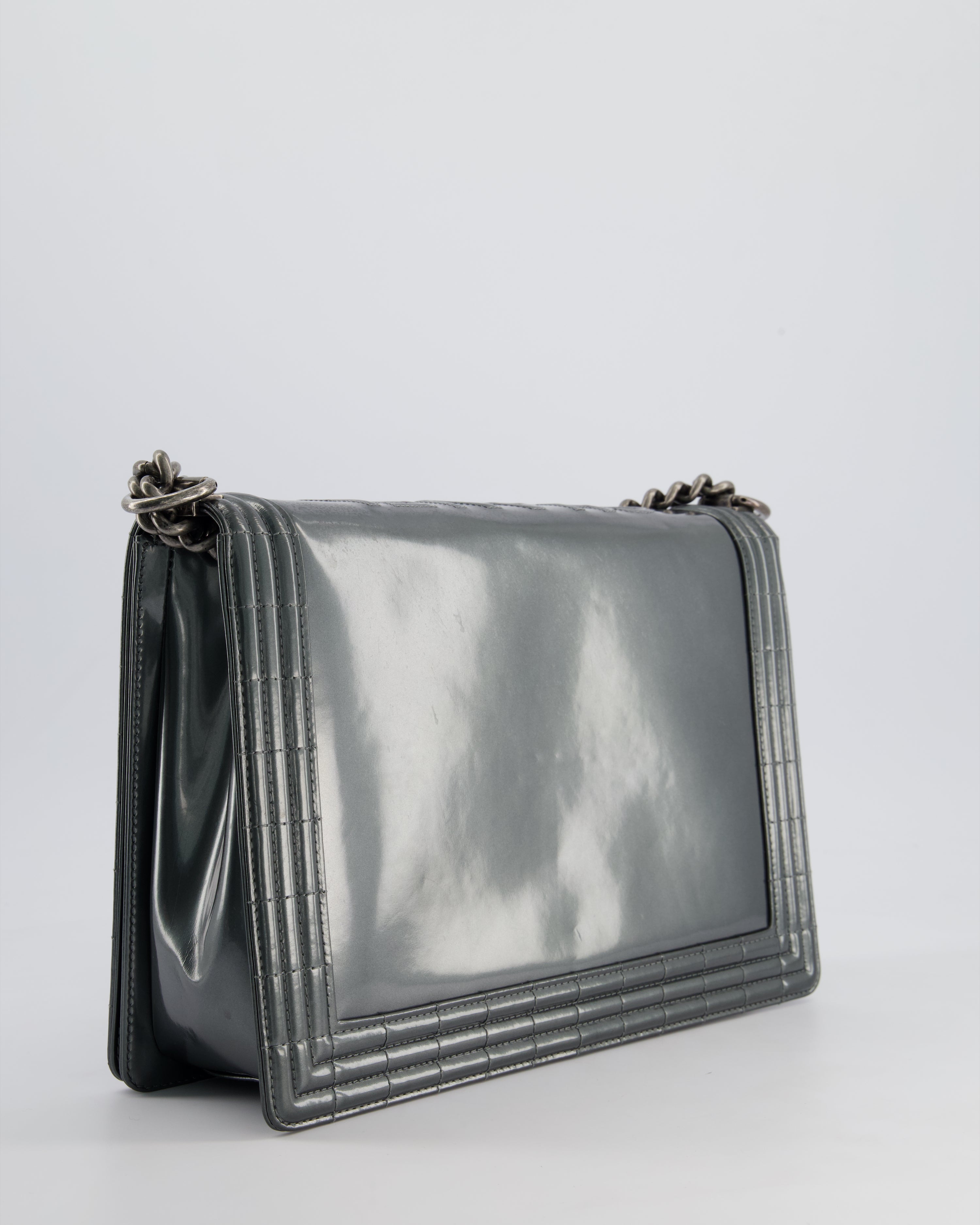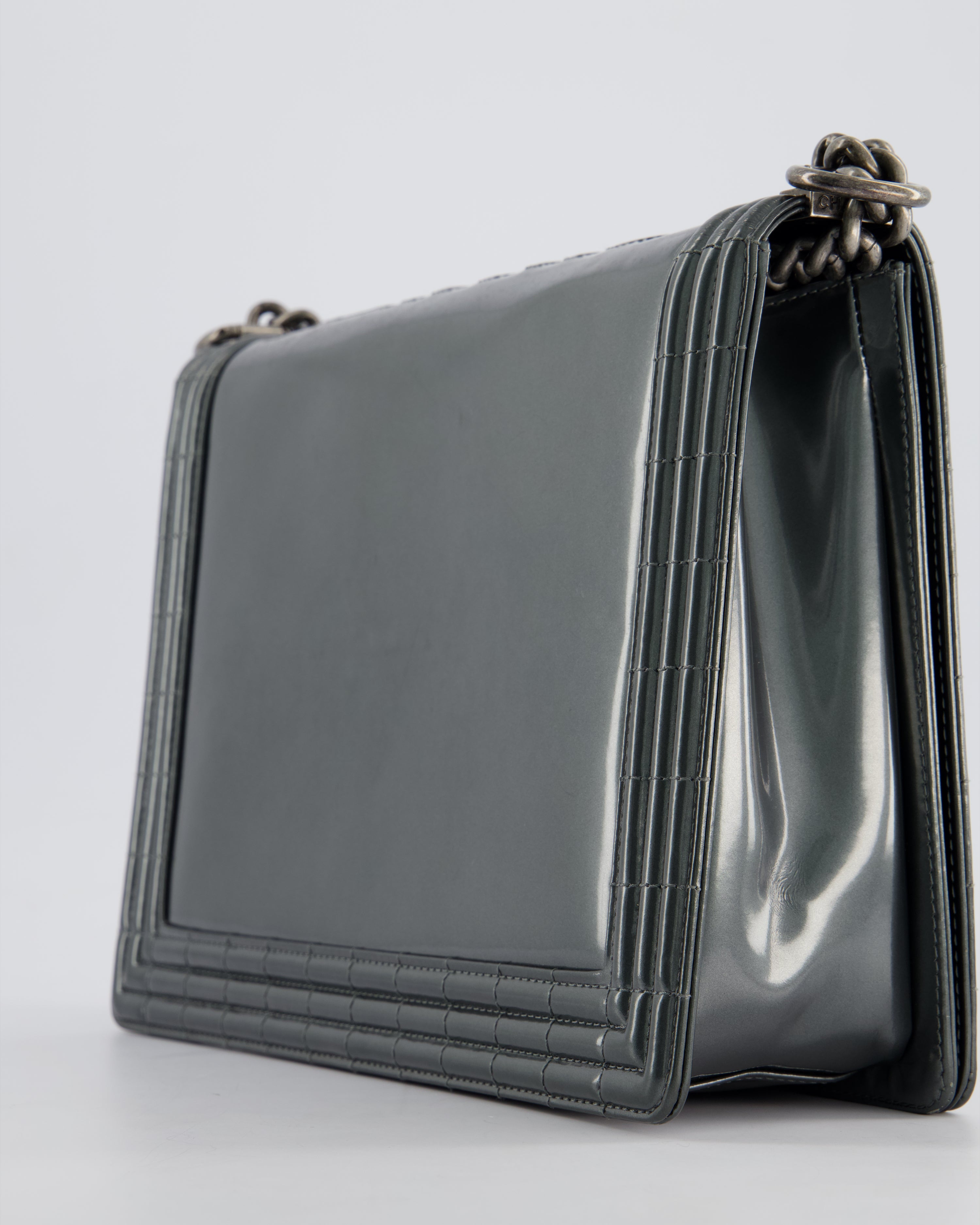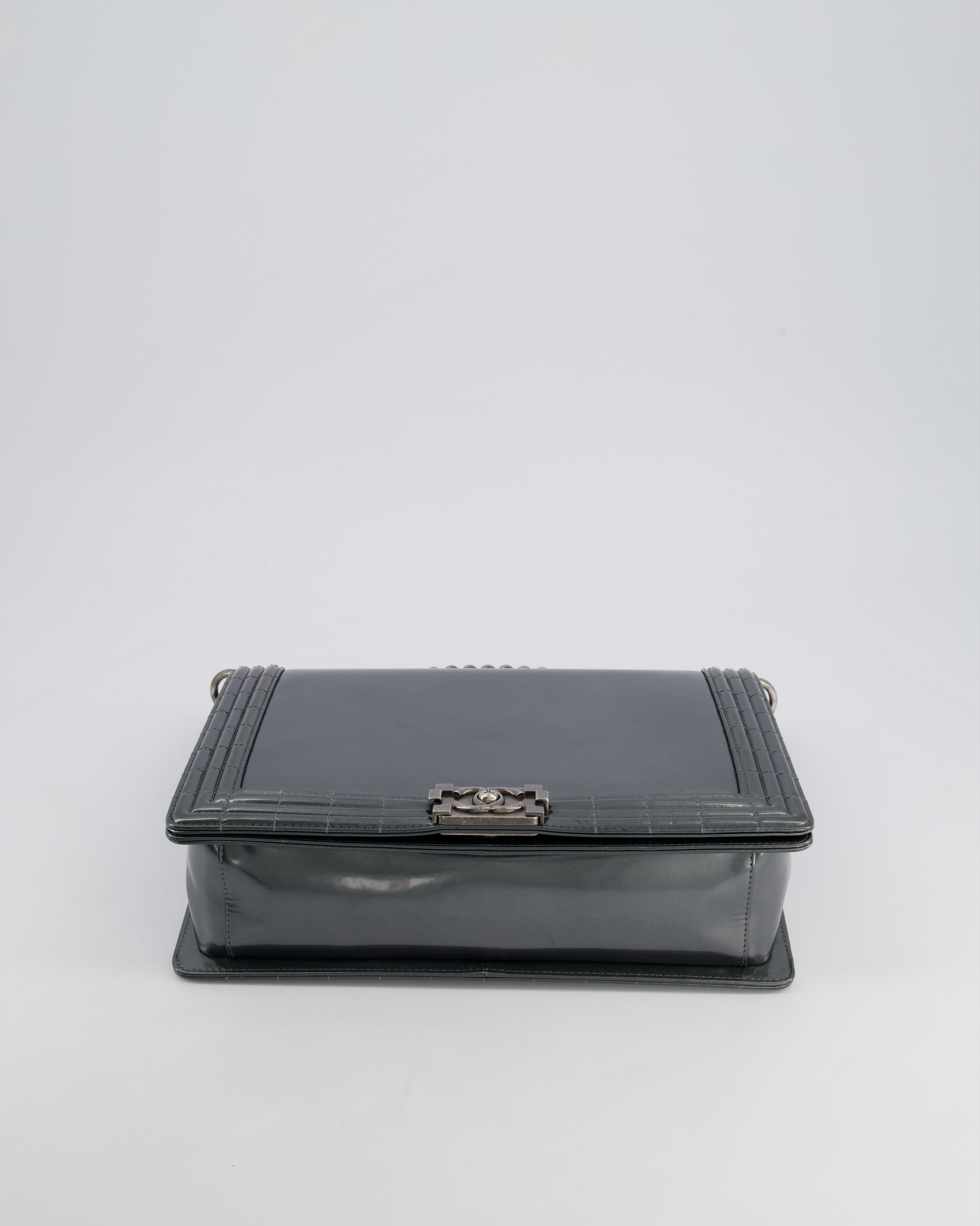 Chanel Large Dark Grey Boy Bag in Patent Leather with Ruthenium Hardware