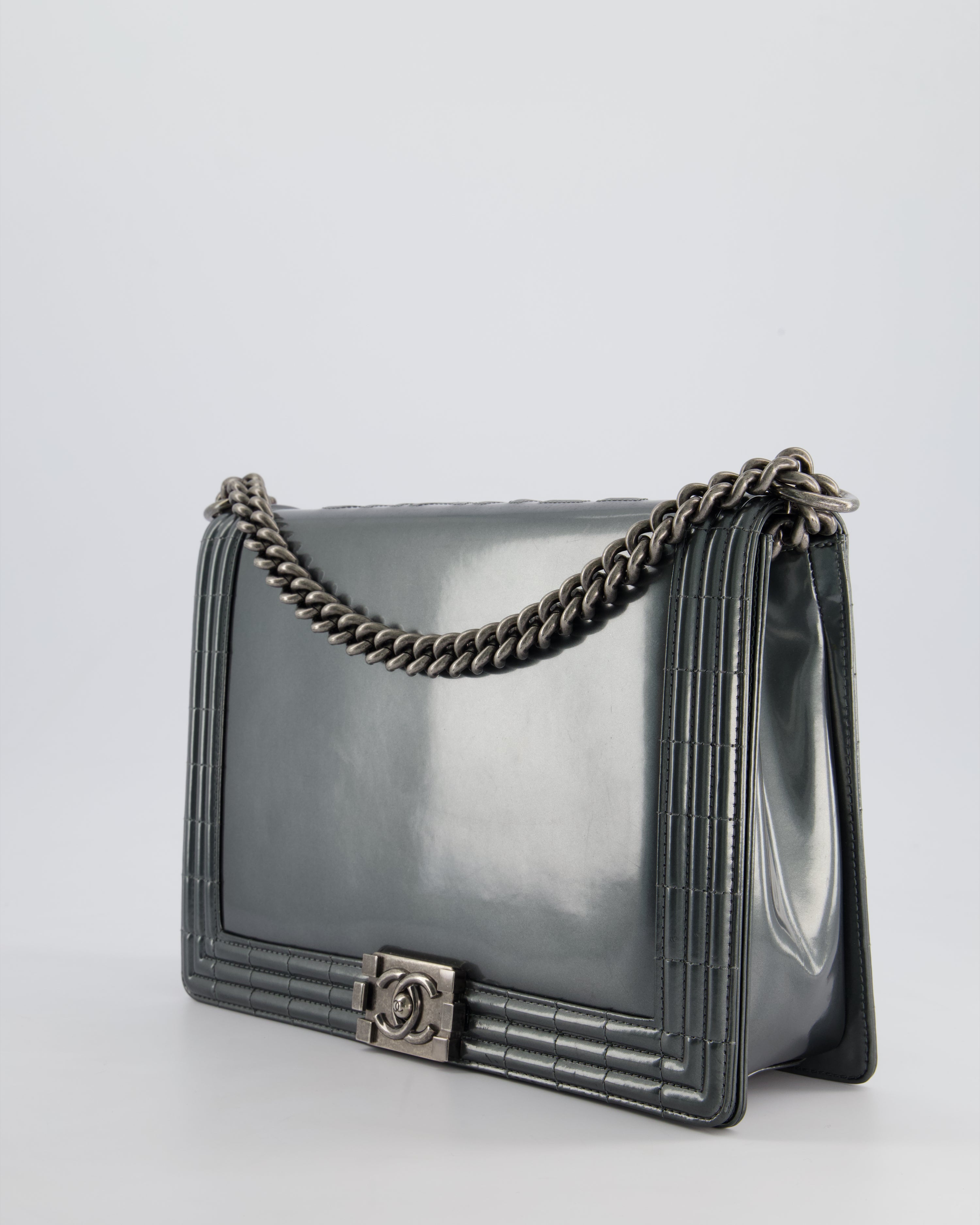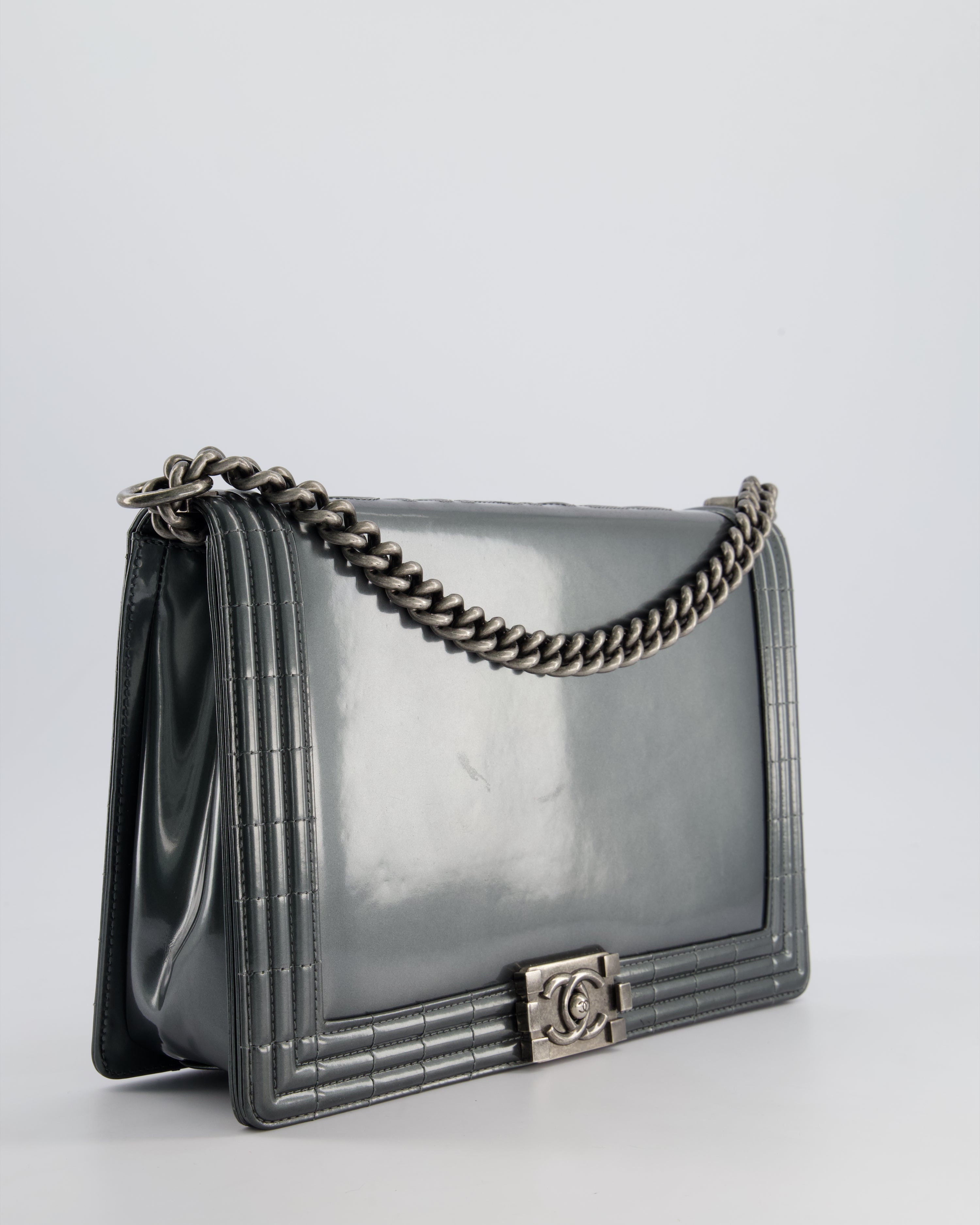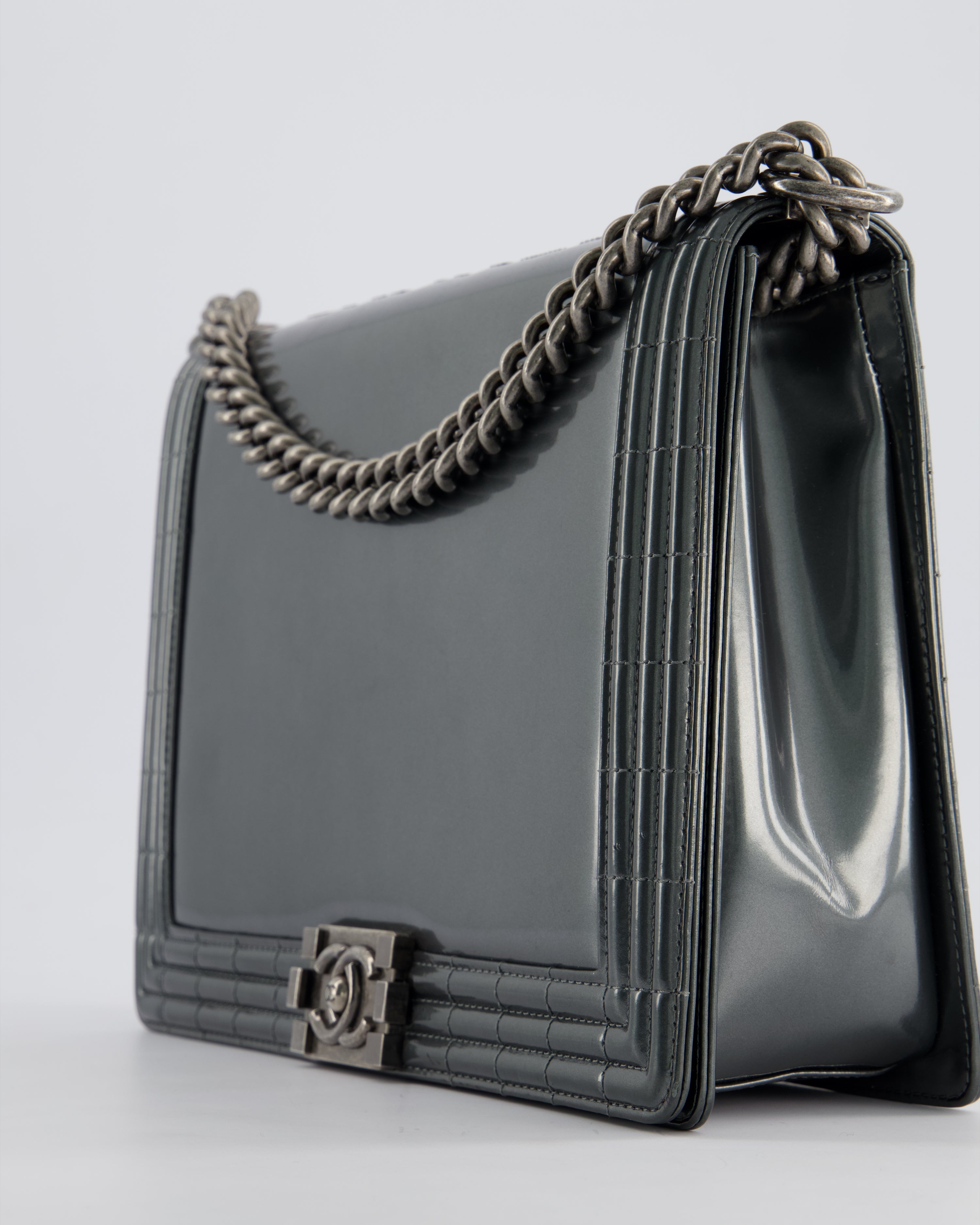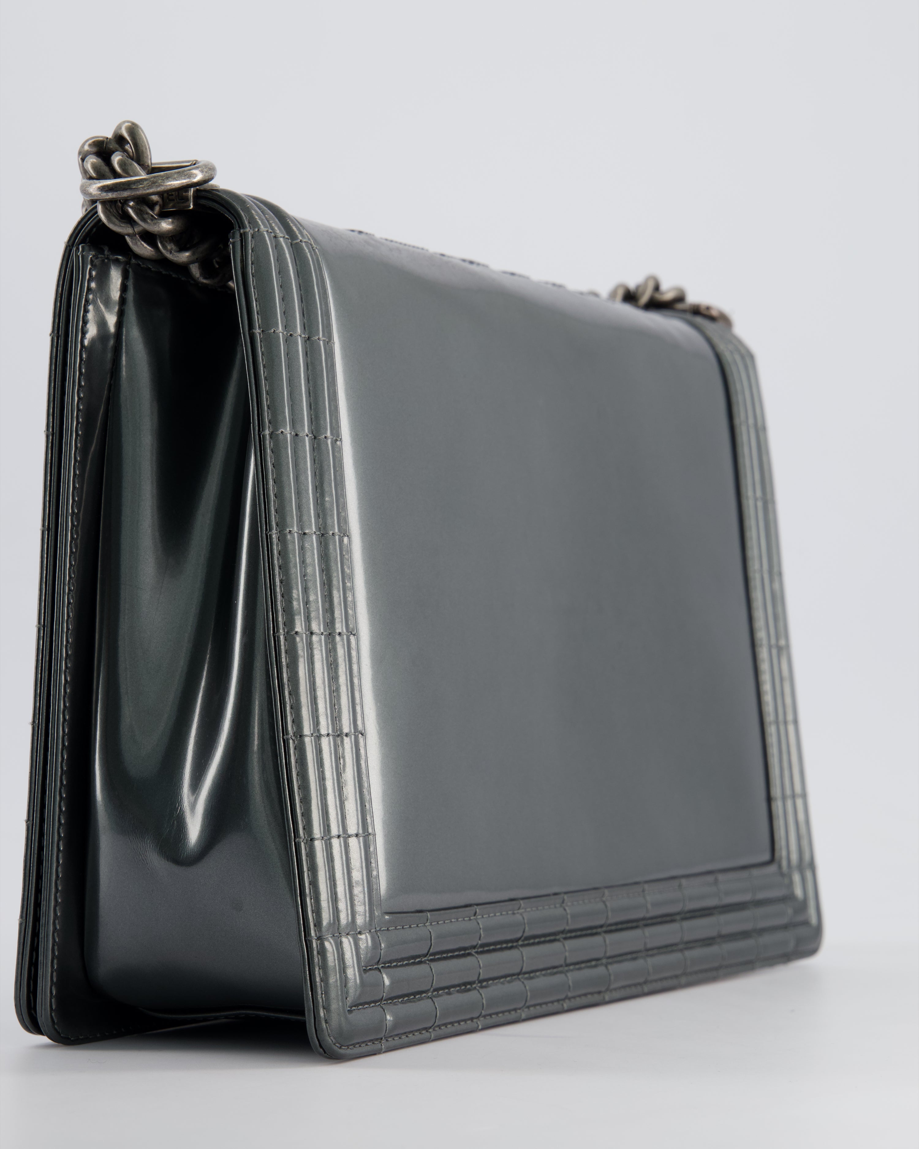 Chanel Large Dark Grey Boy Bag in Patent Leather with Ruthenium Hardware