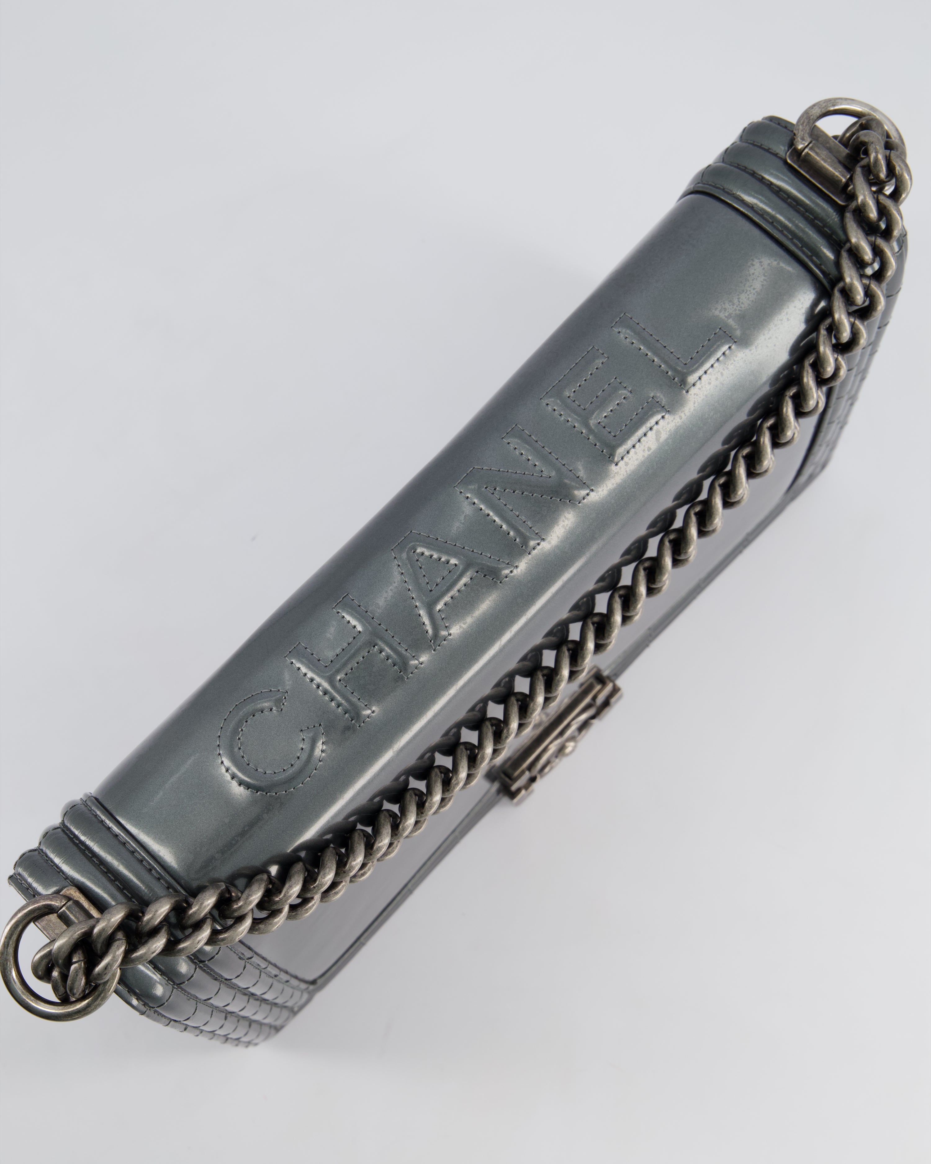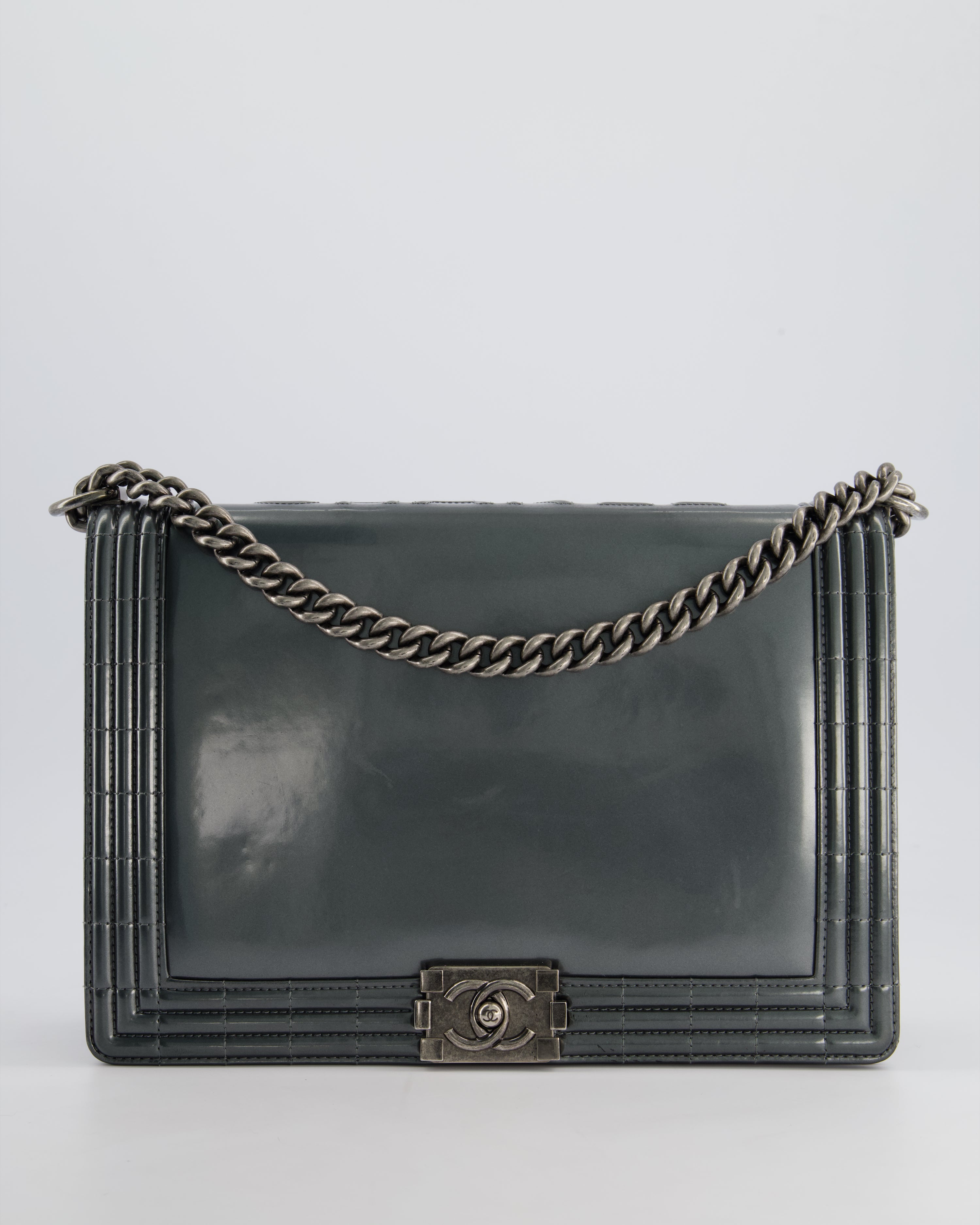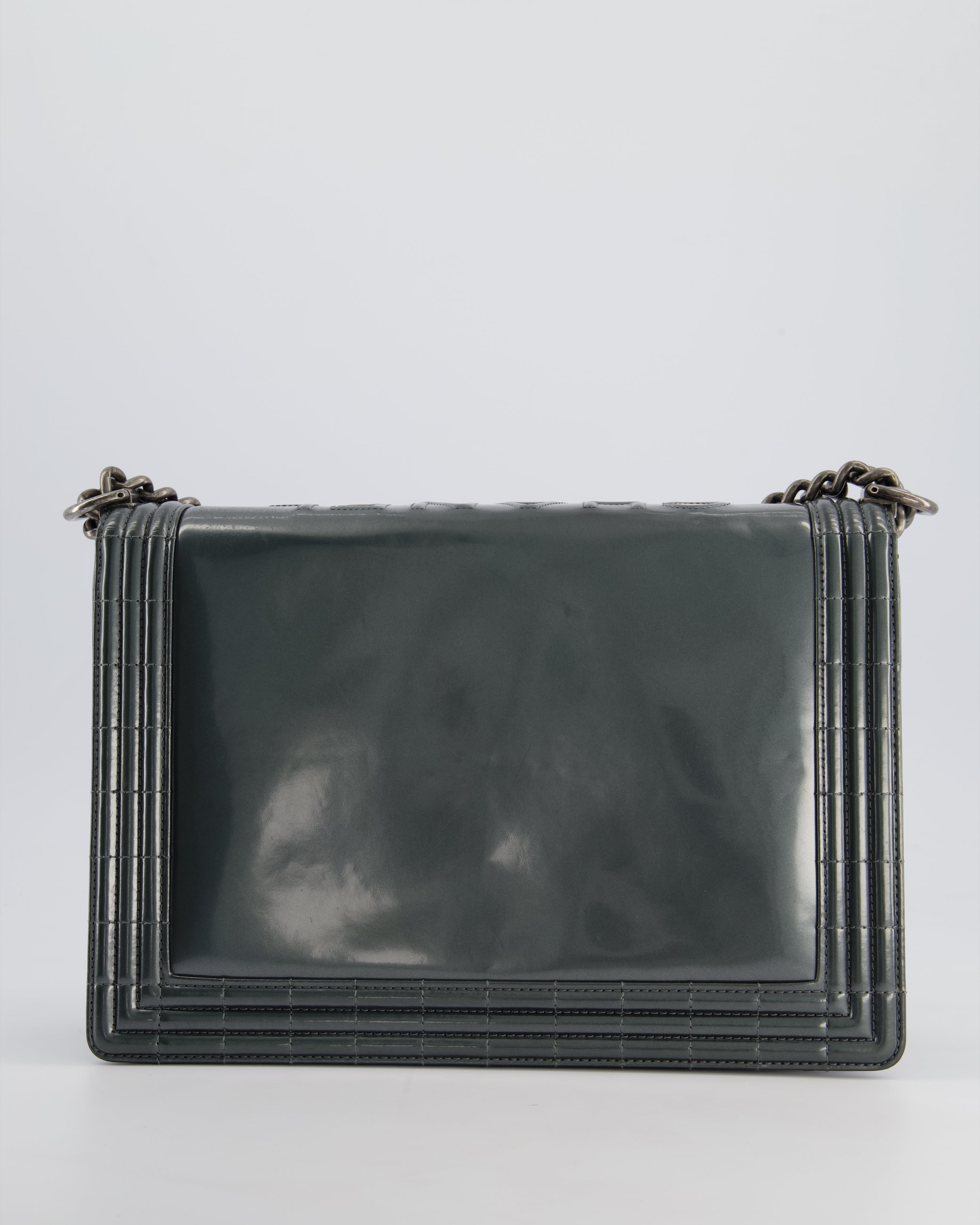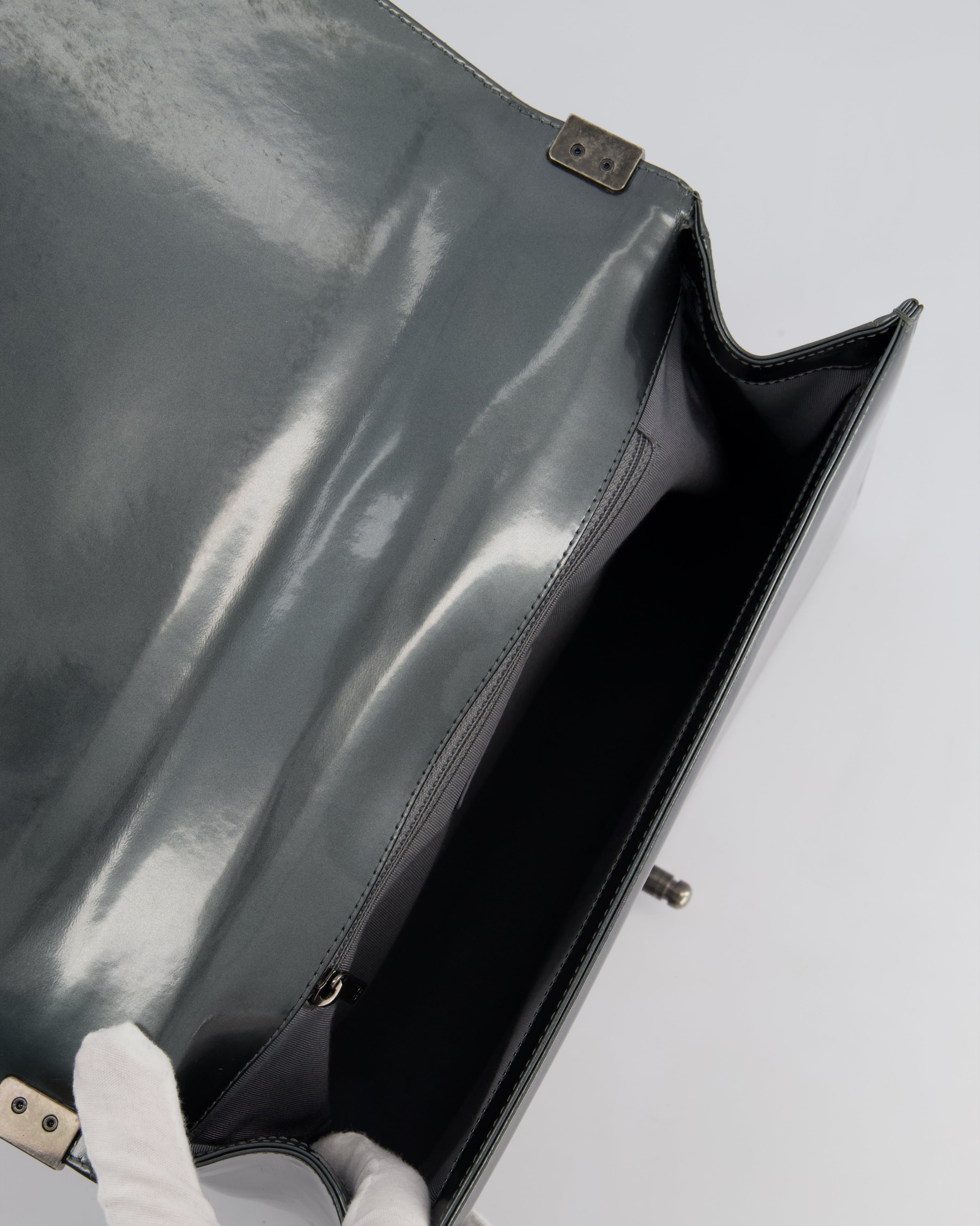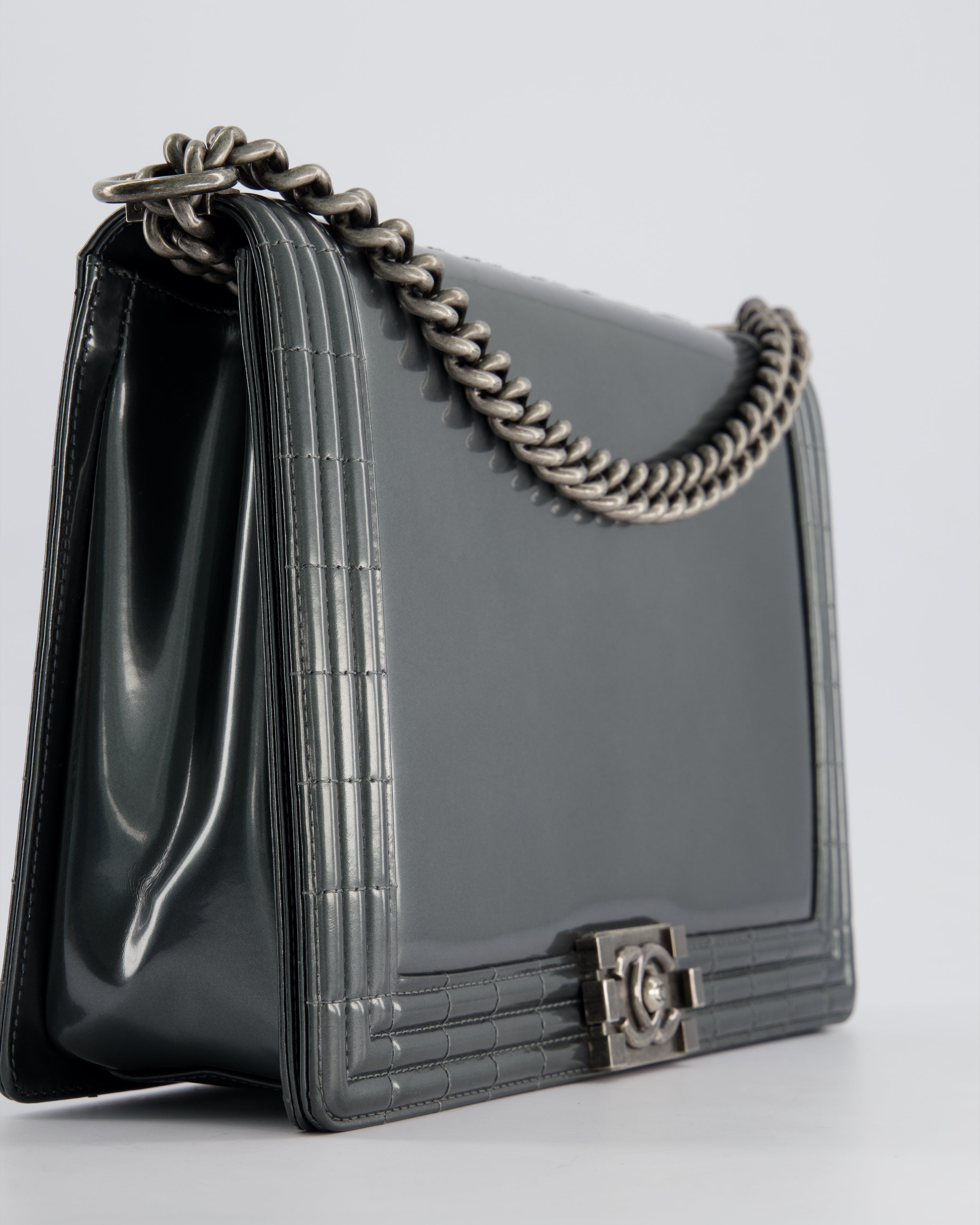 Chanel Large Dark Grey Boy Bag in Patent Leather with Ruthenium Hardware