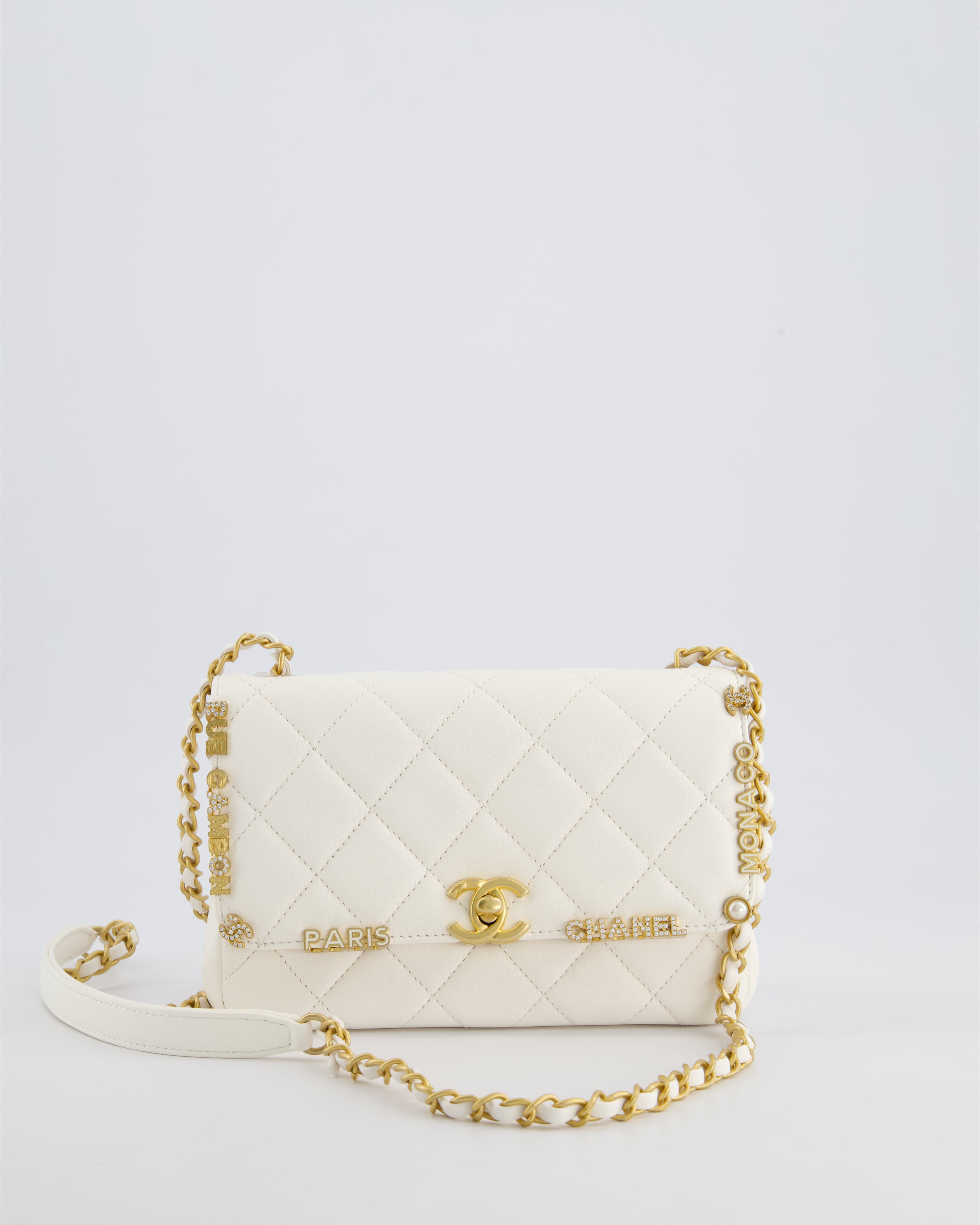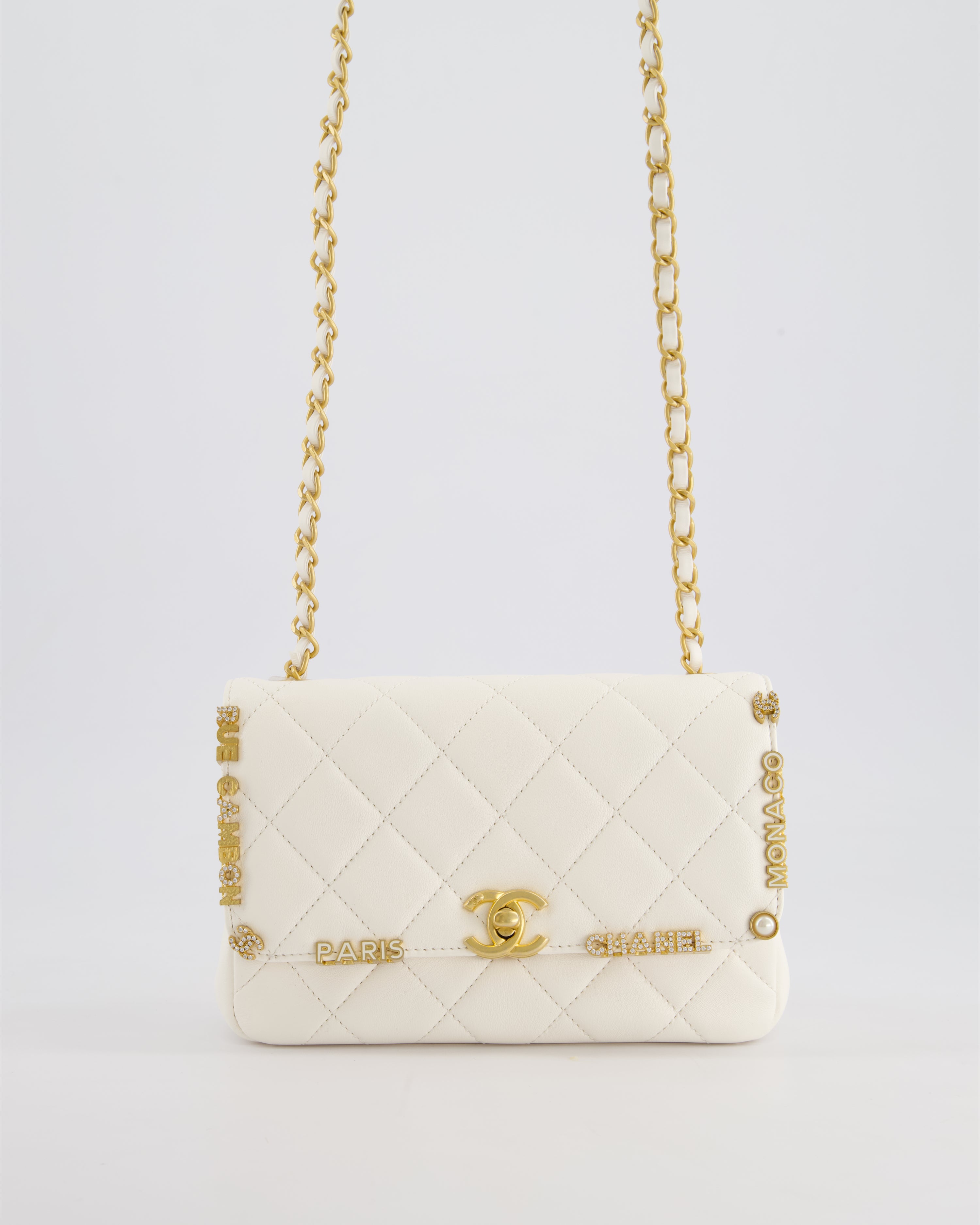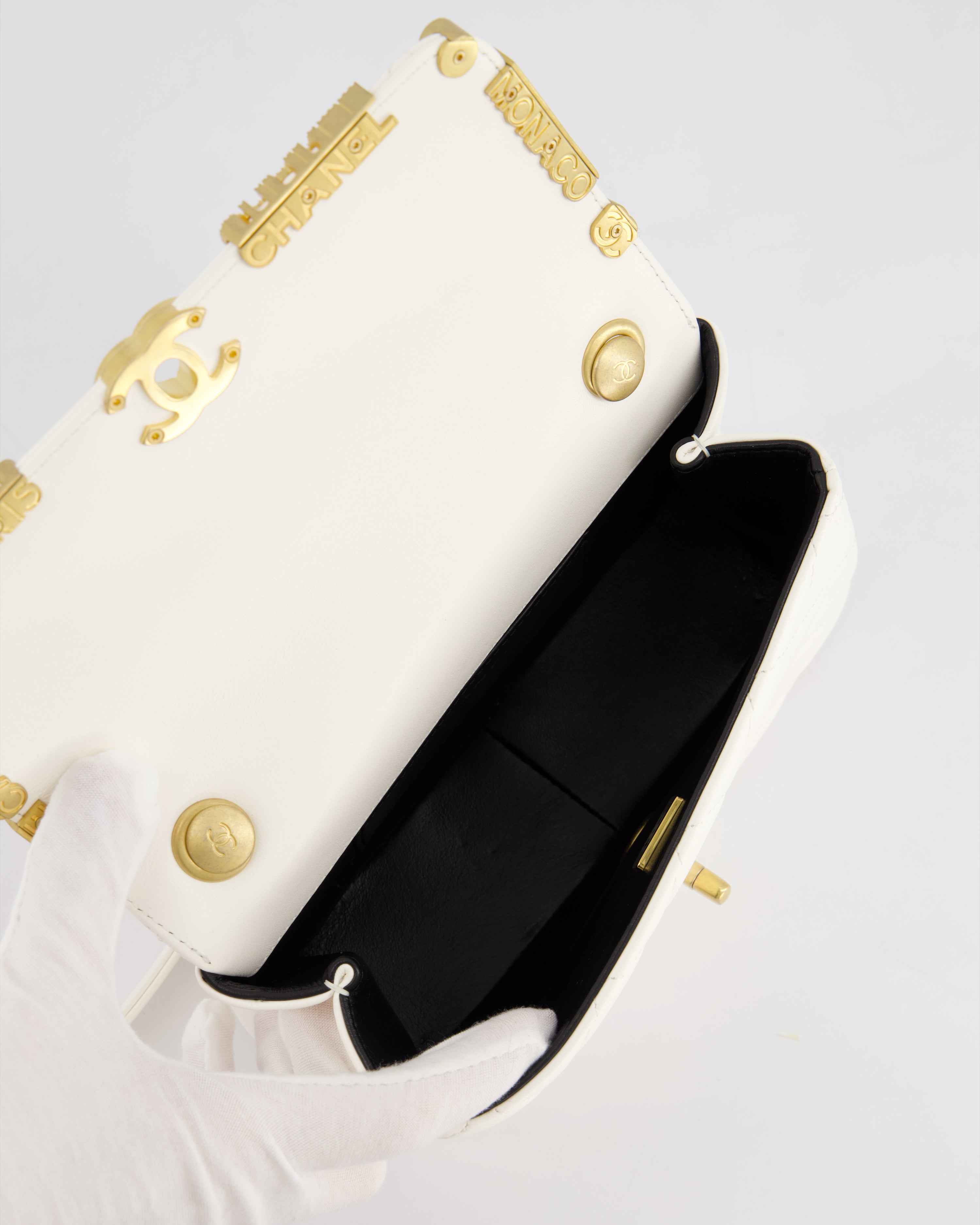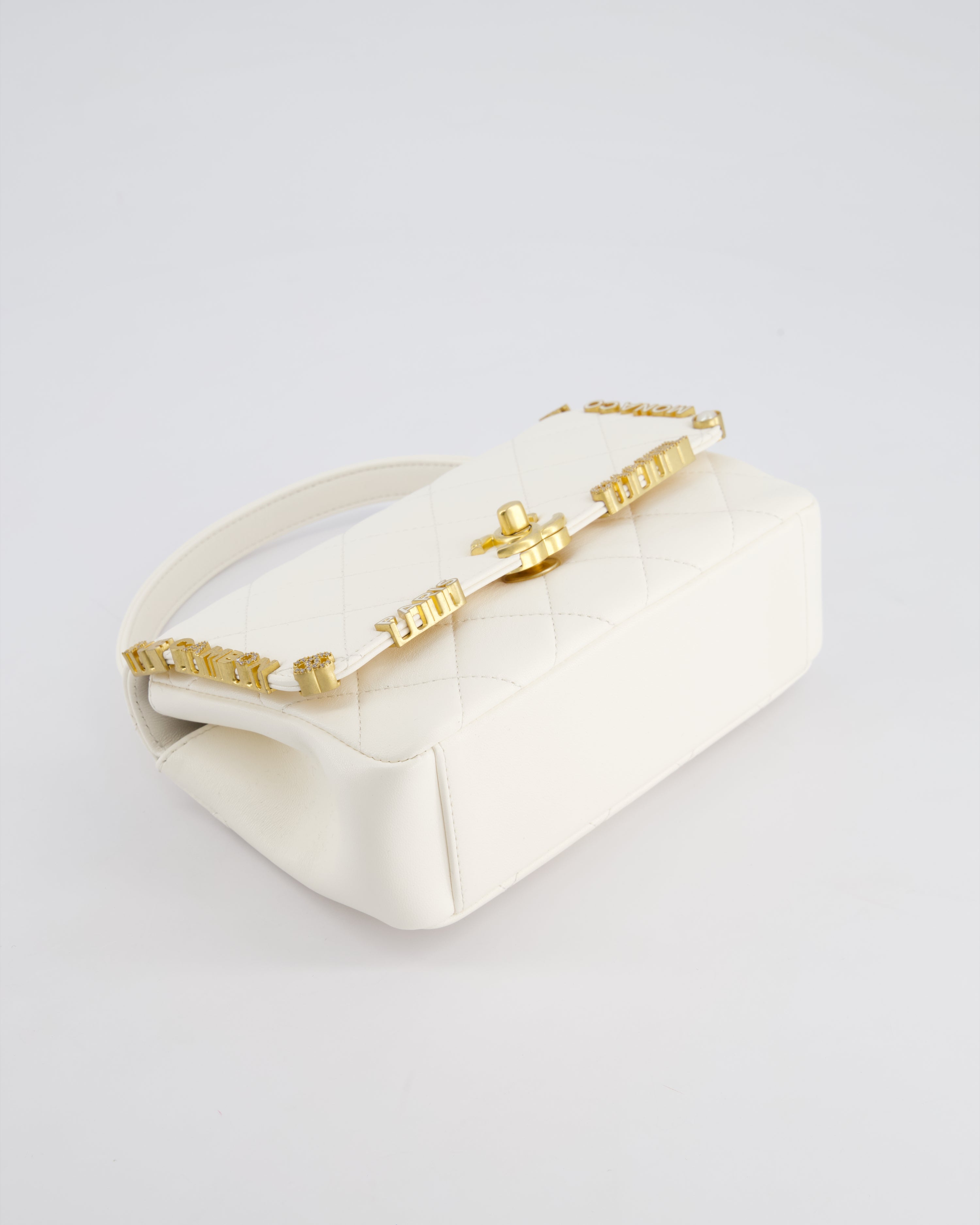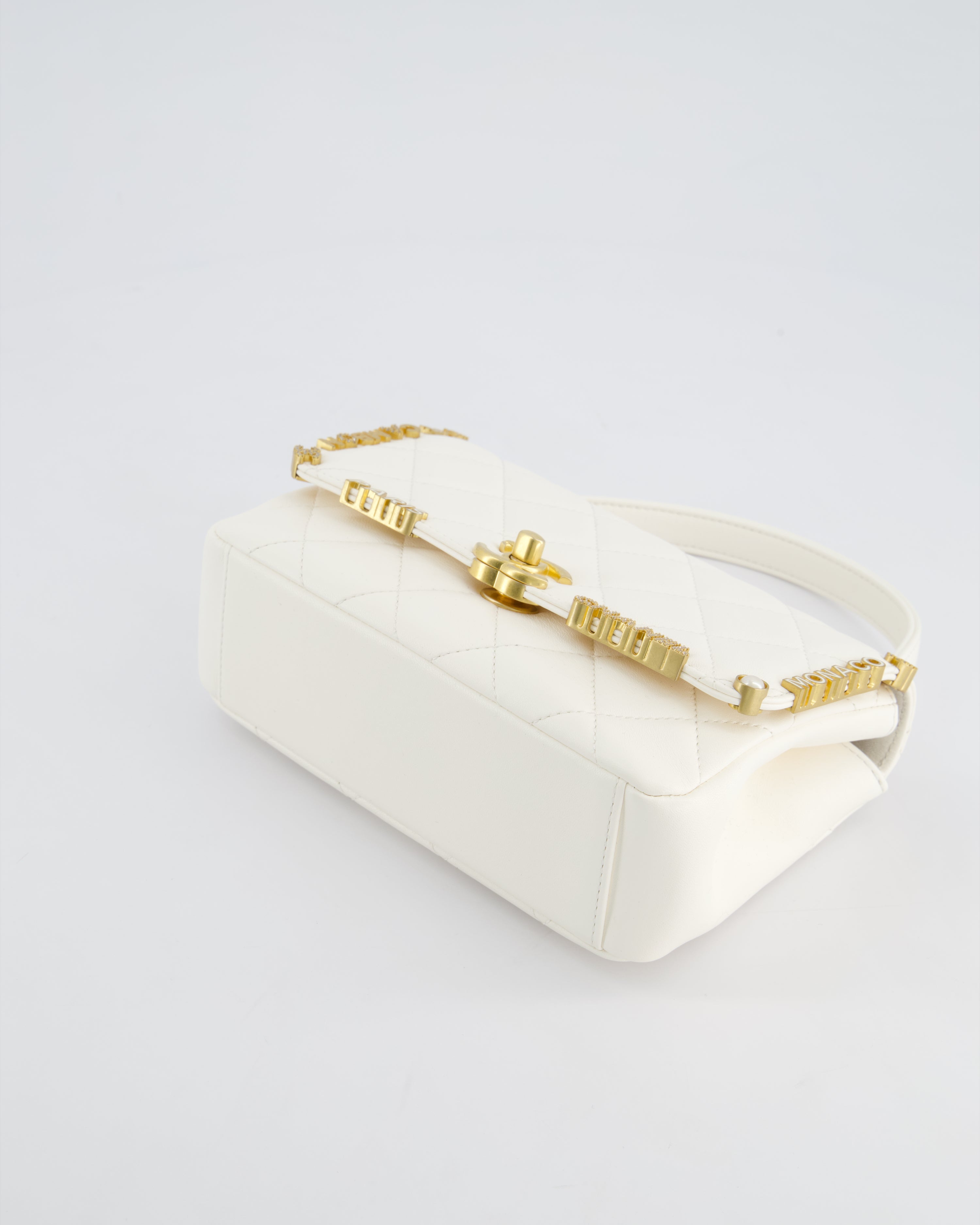 *LIMITED EDITION* Chanel White Paris Monaco Mini Single Flap Bag with Black Interior, Crystal Details and Brushed Gold Hardware