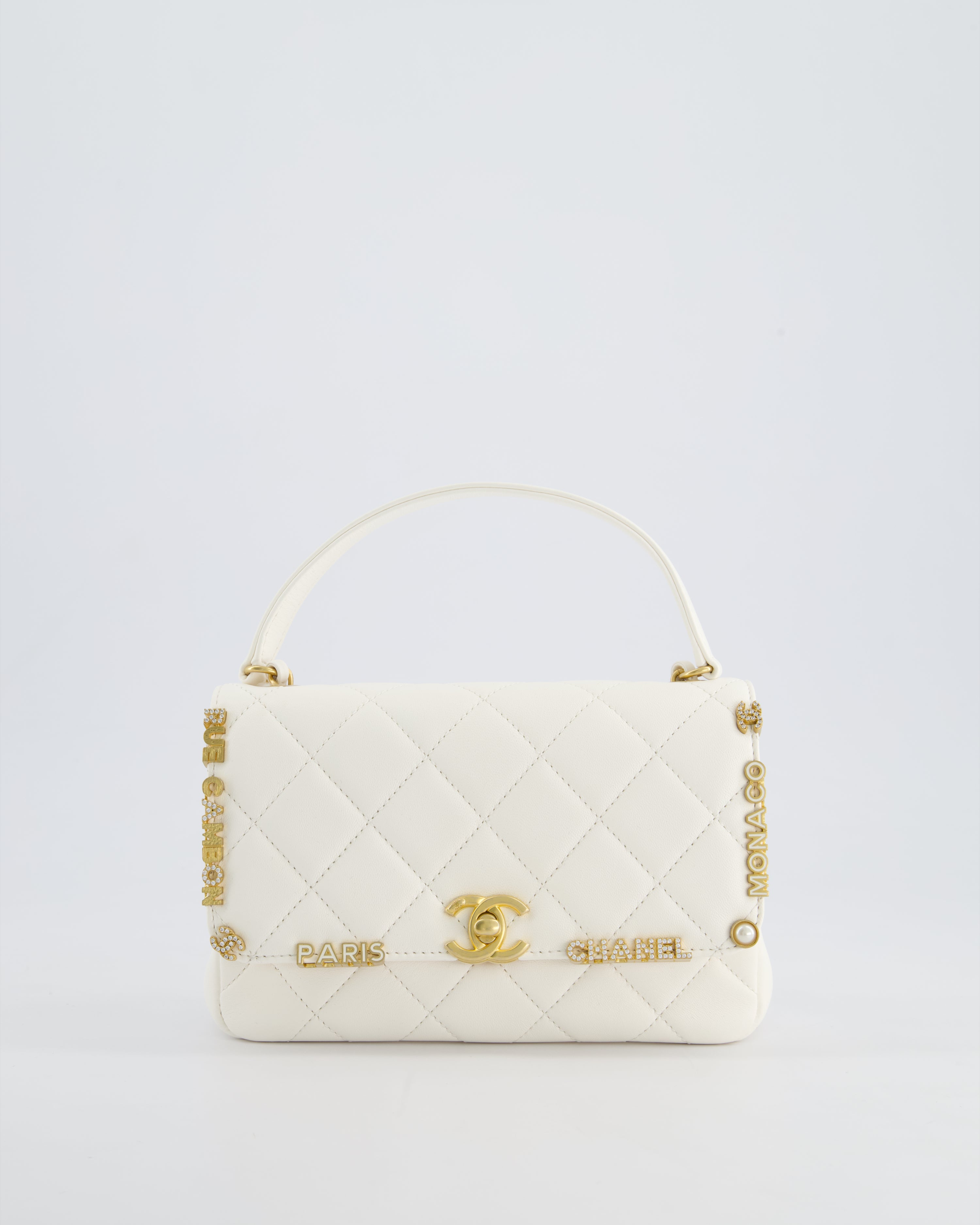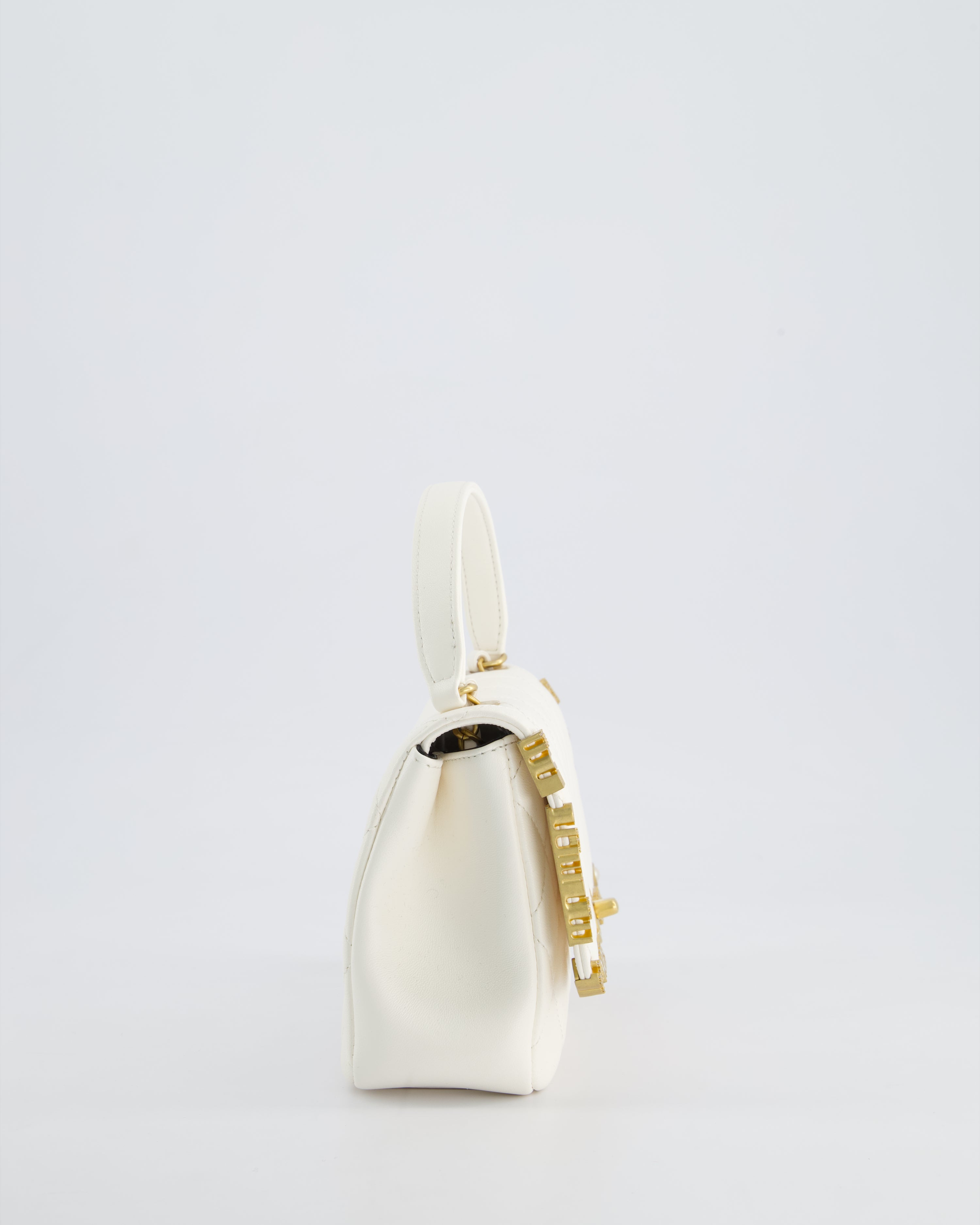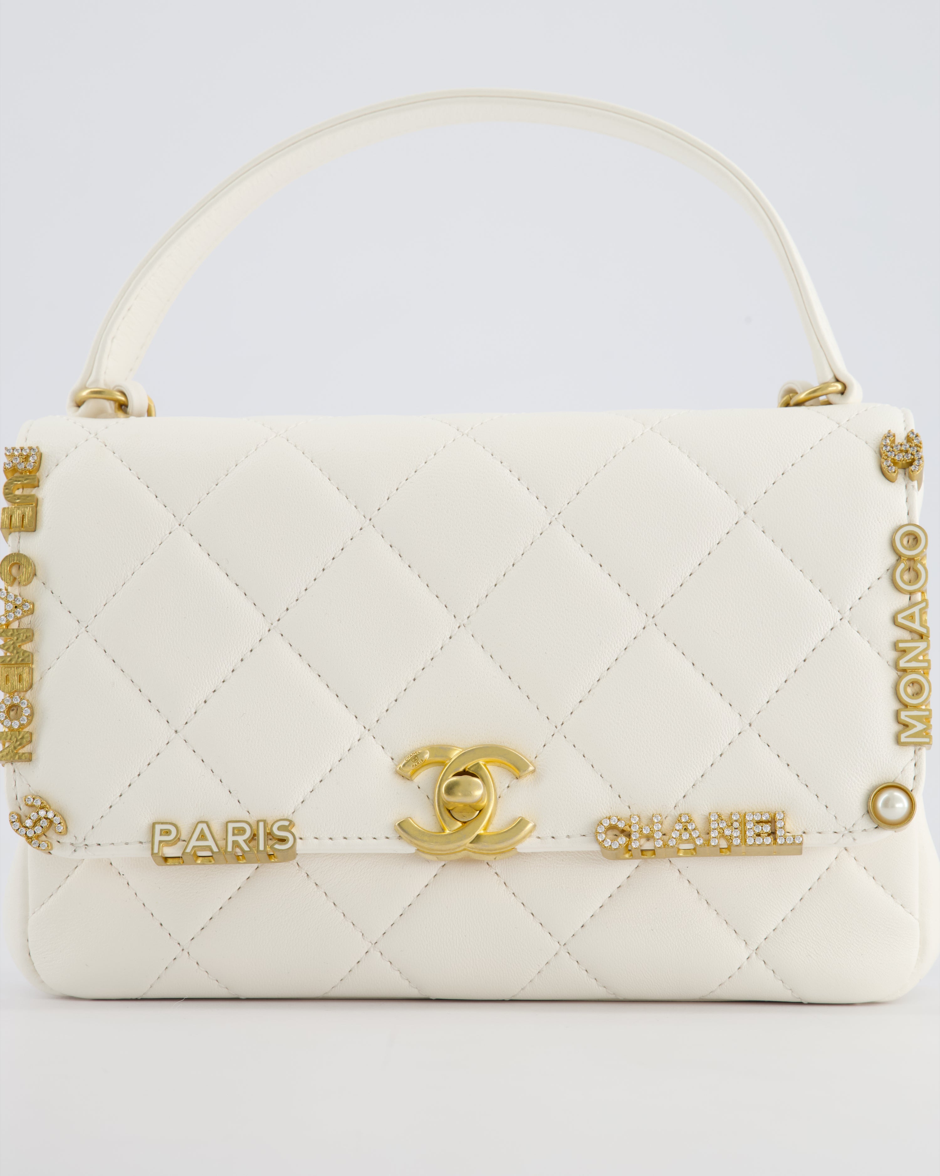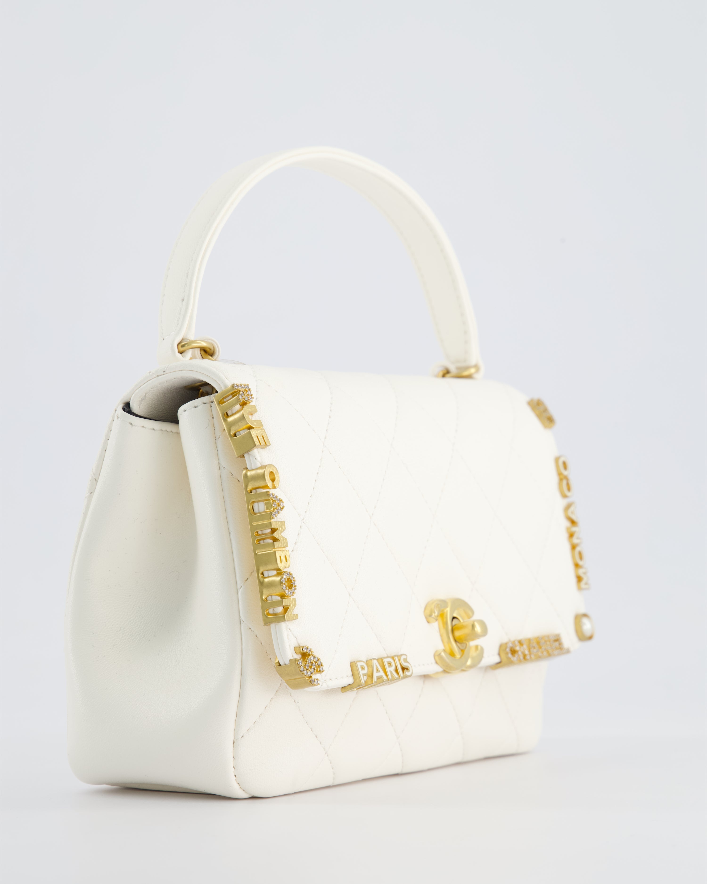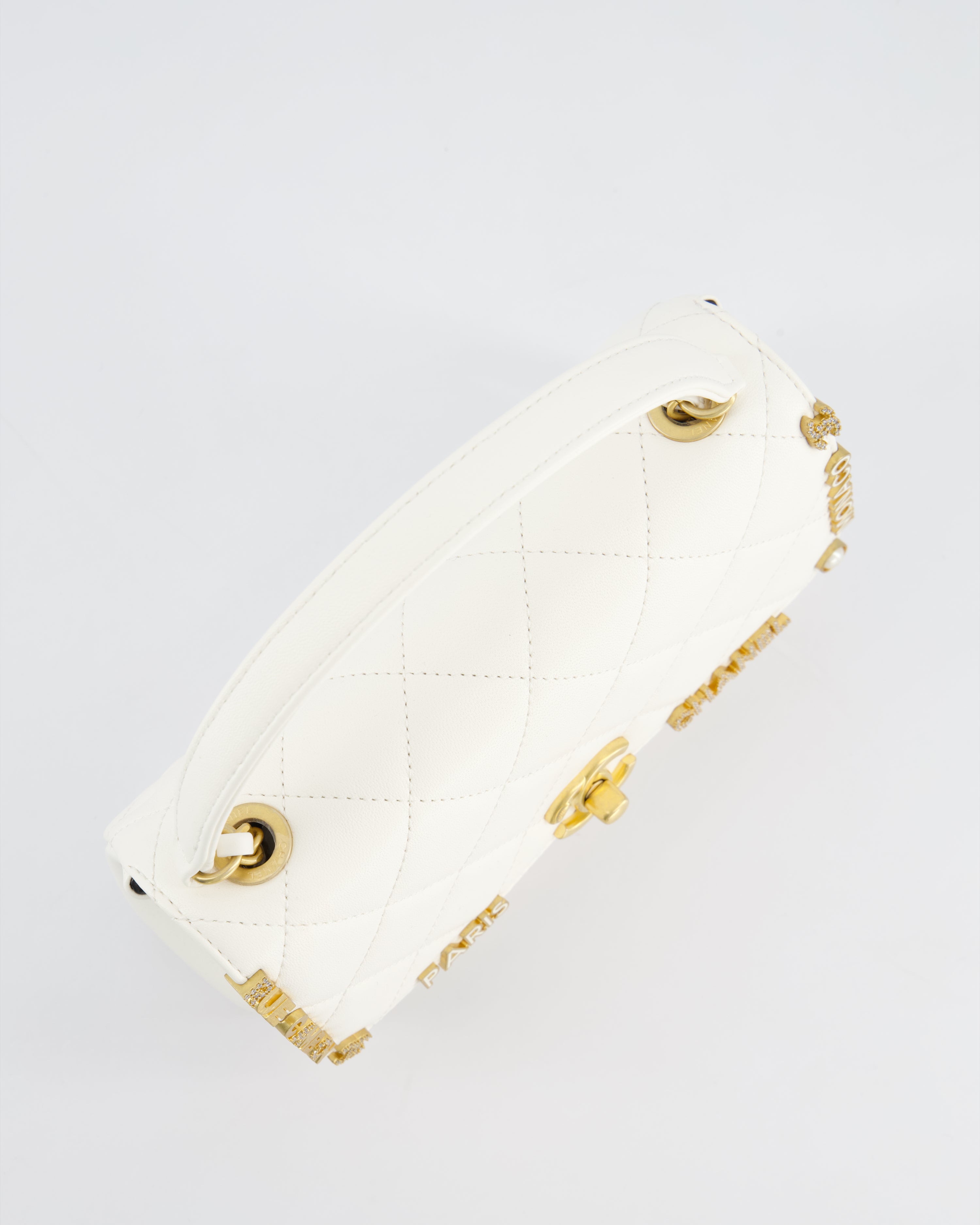 *LIMITED EDITION* Chanel White Paris Monaco Mini Single Flap Bag with Black Interior, Crystal Details and Brushed Gold Hardware
