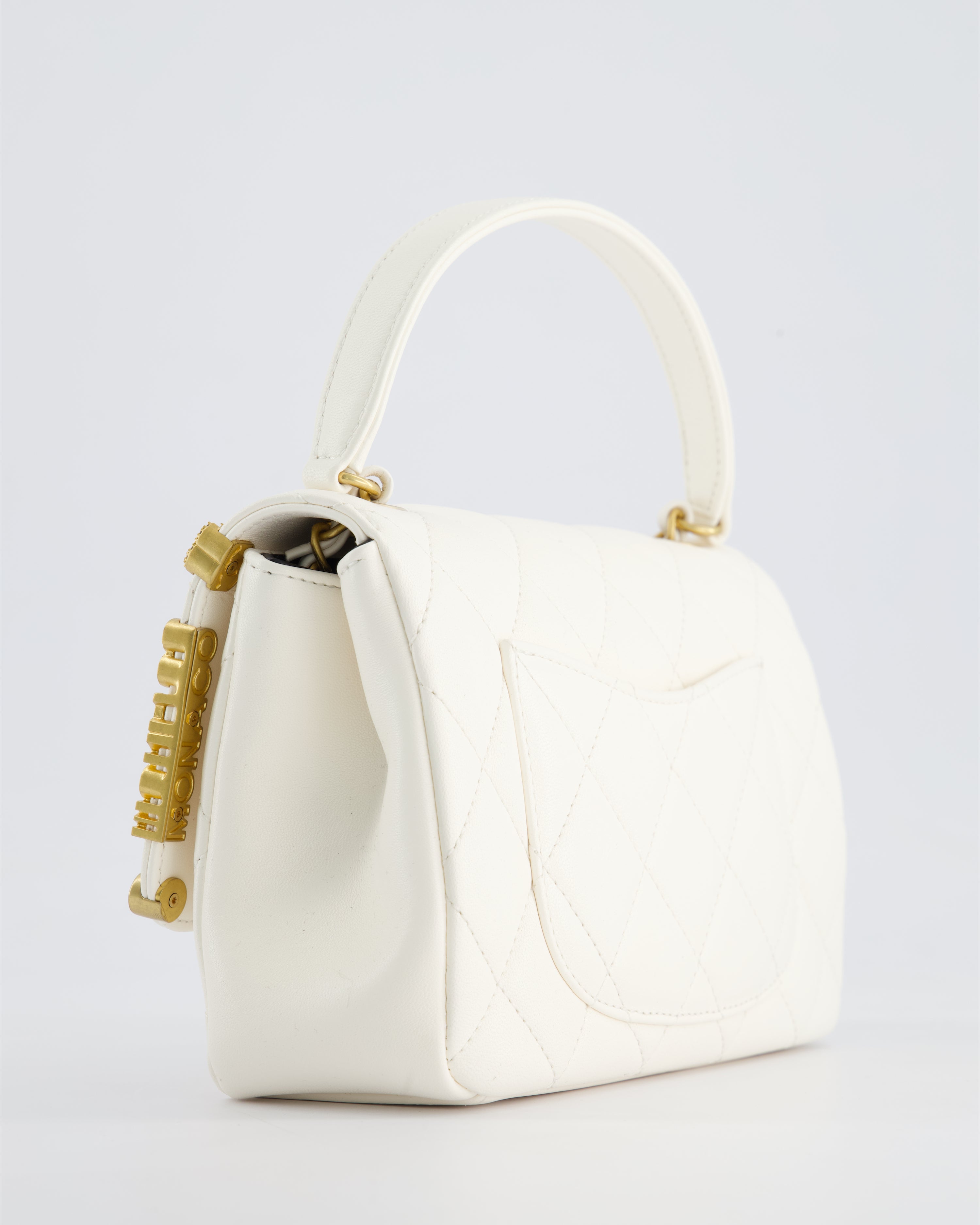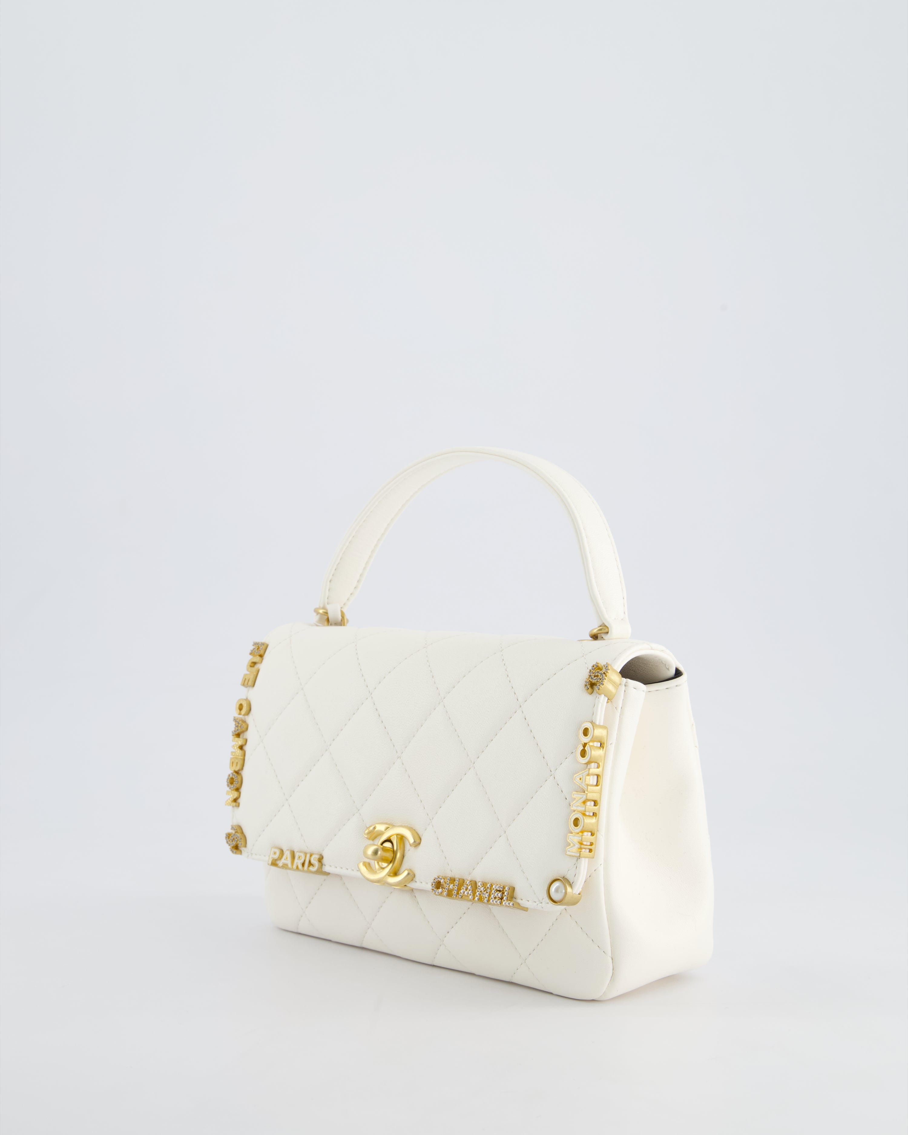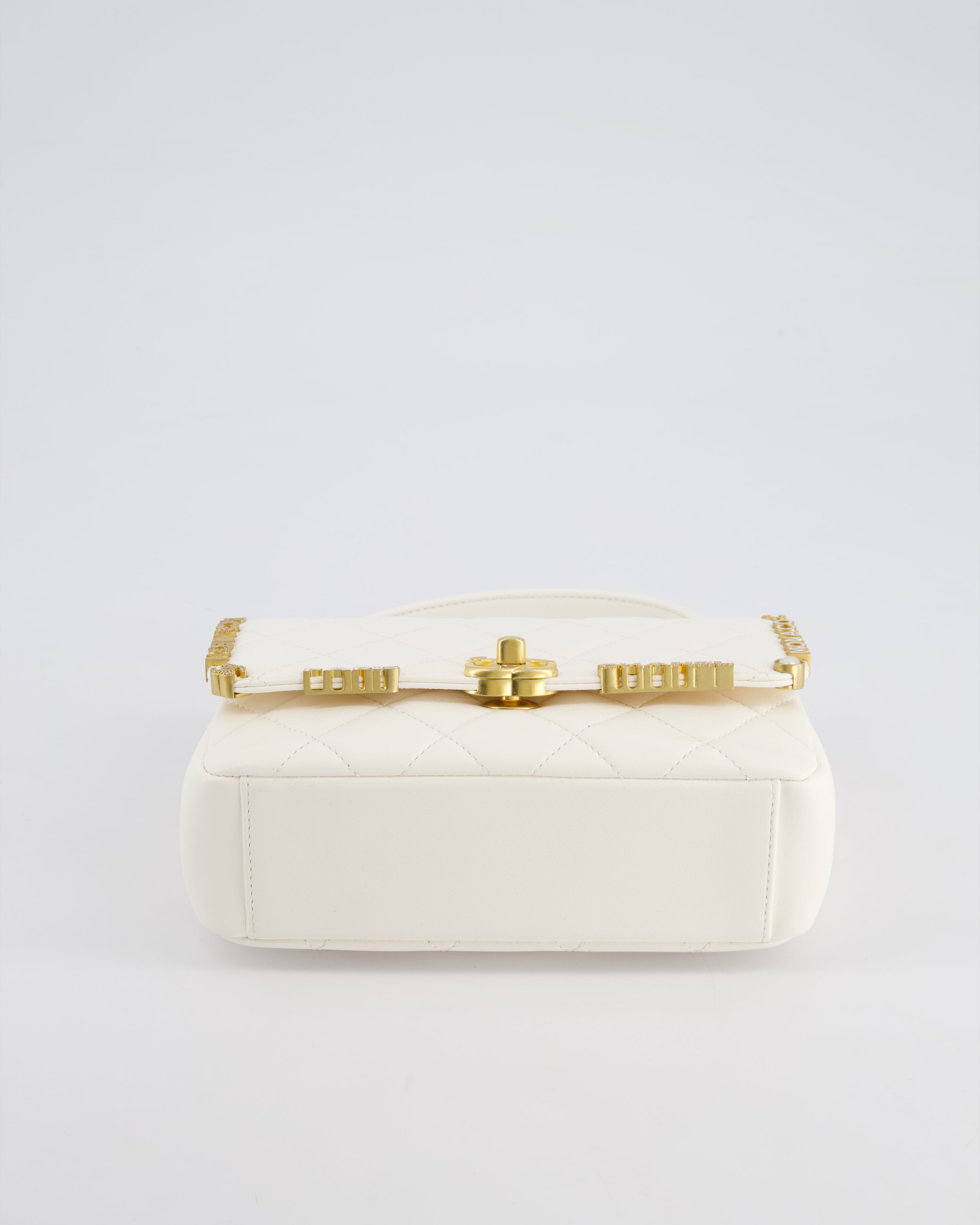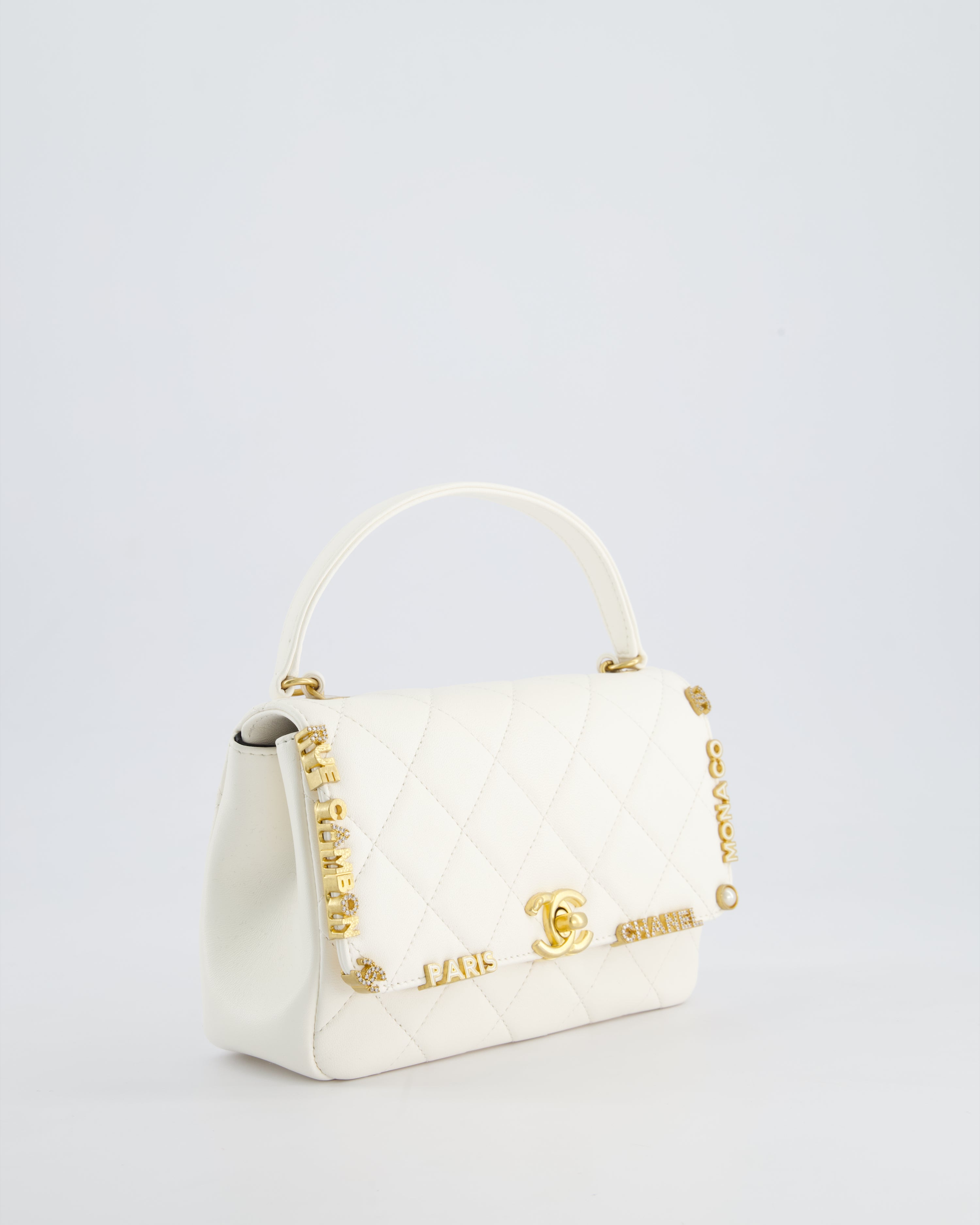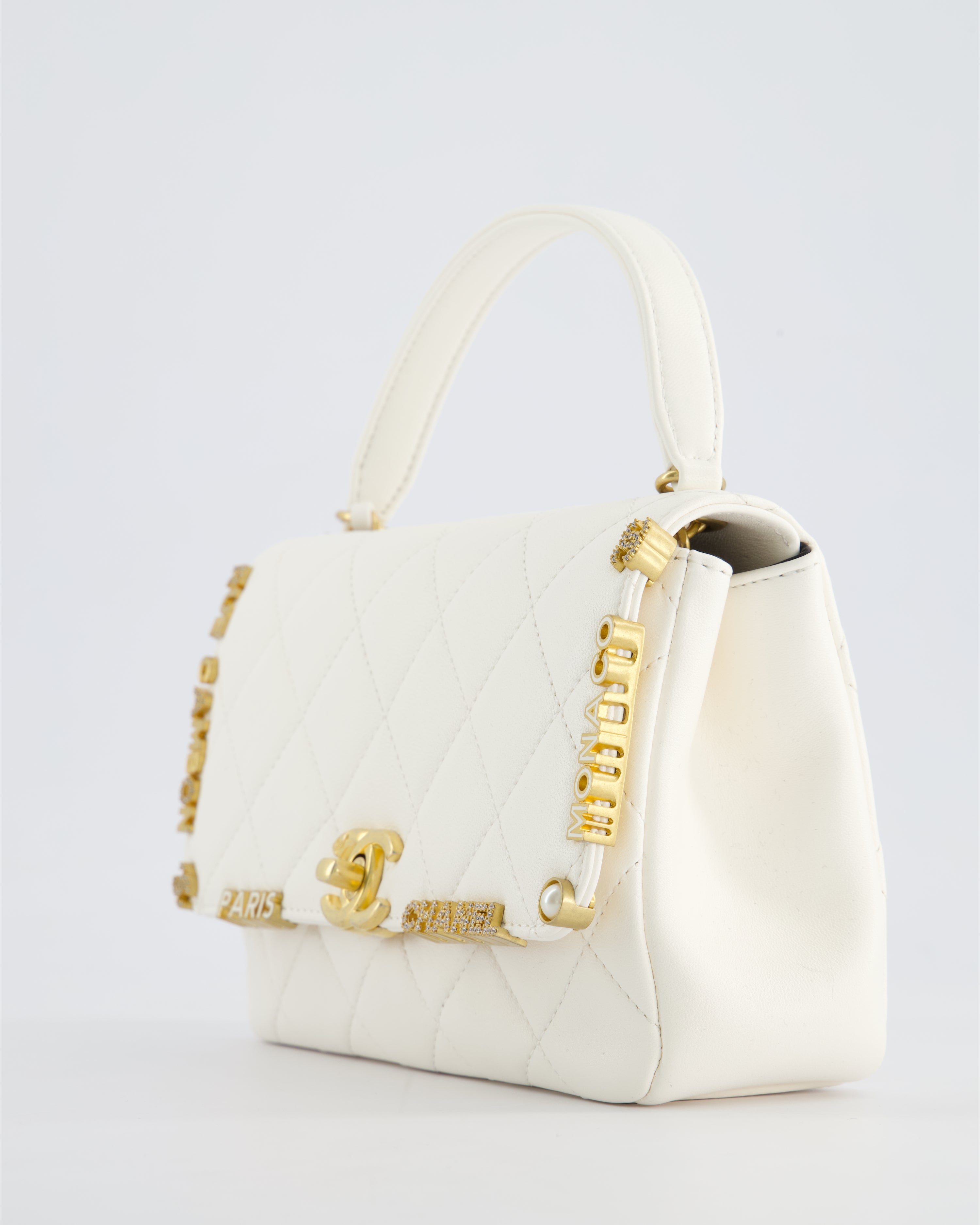 *LIMITED EDITION* Chanel White Paris Monaco Mini Single Flap Bag with Black Interior, Crystal Details and Brushed Gold Hardware