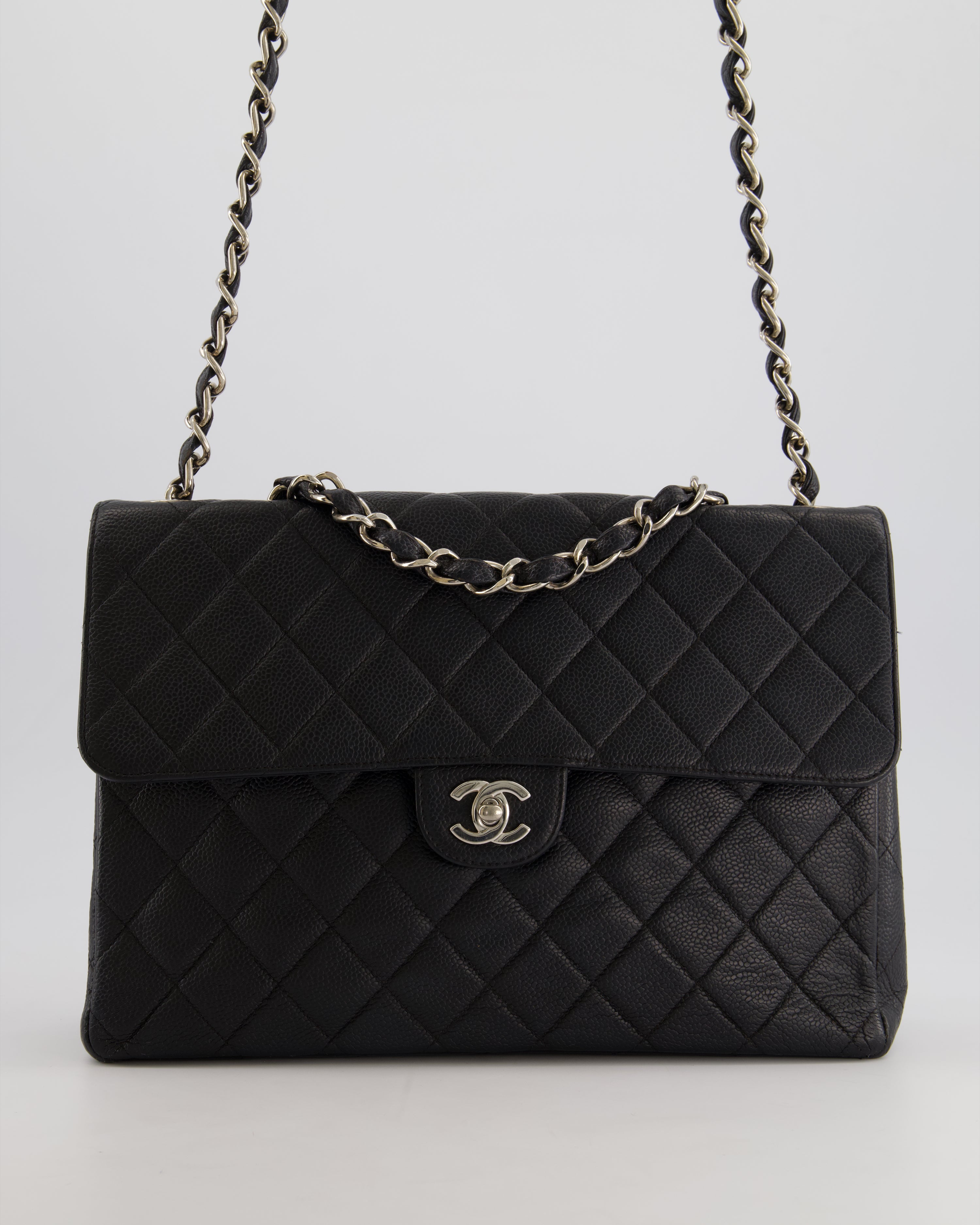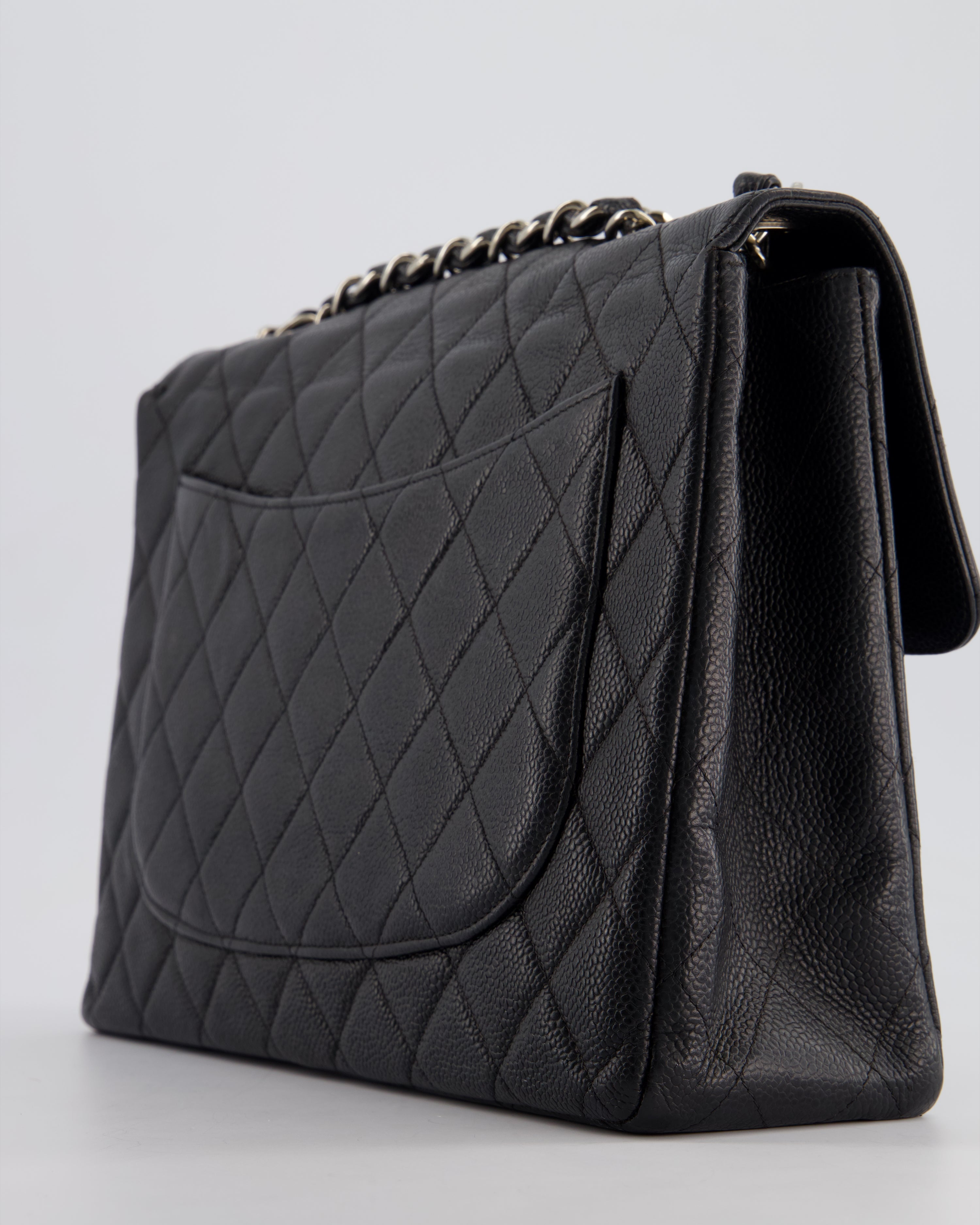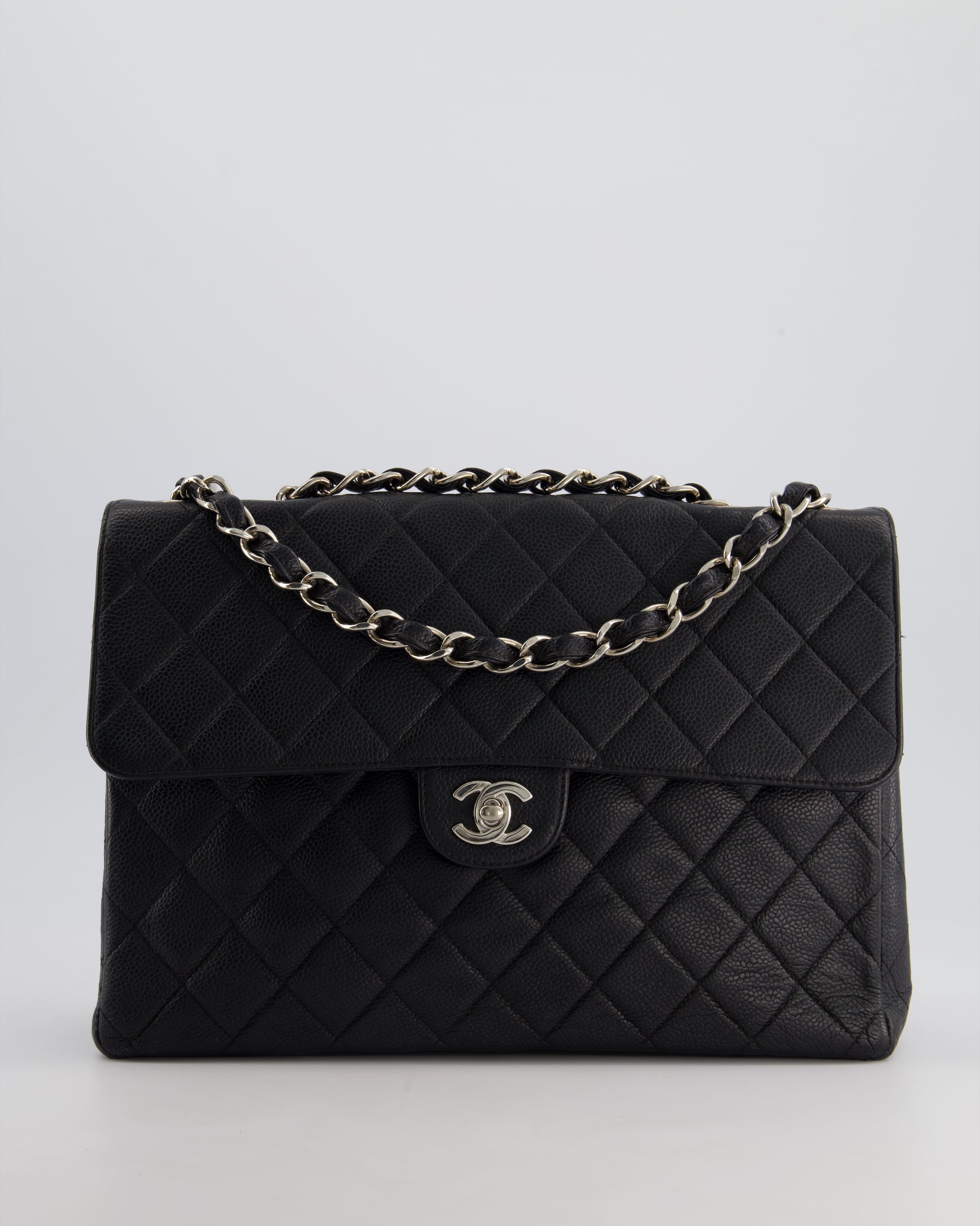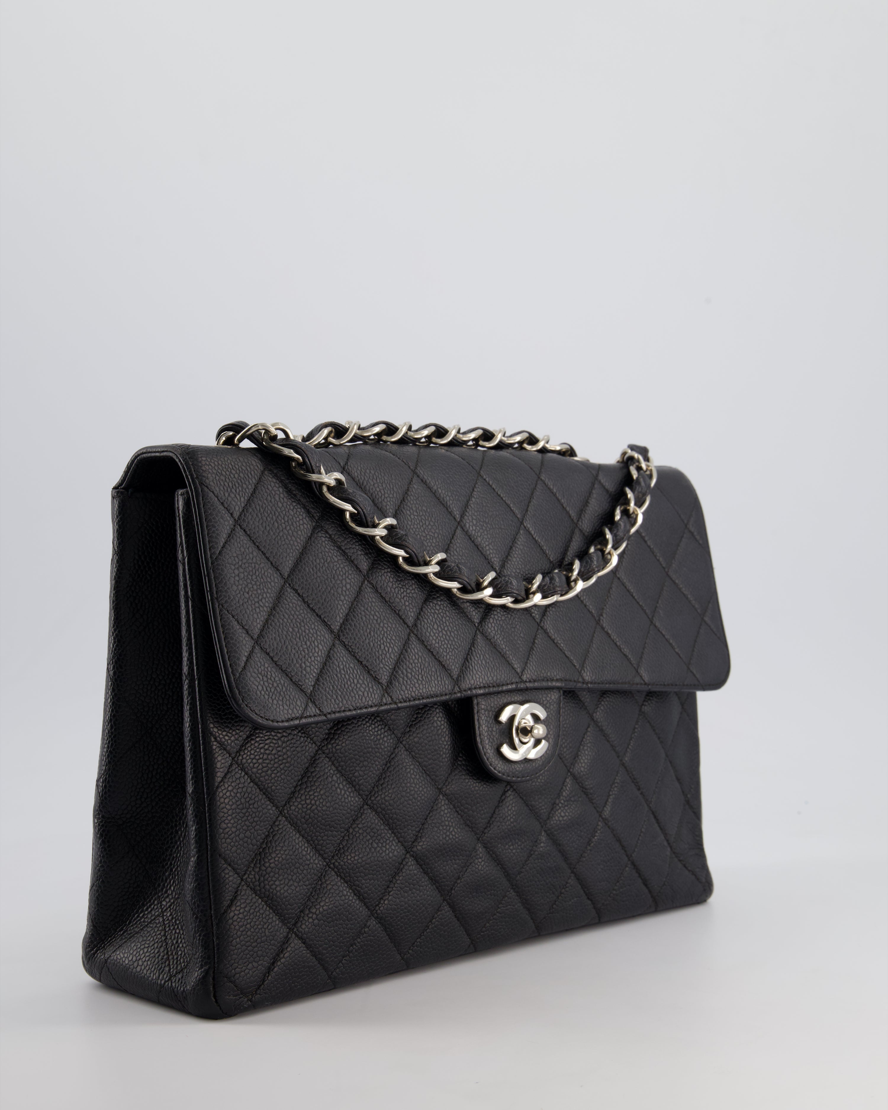 Chanel Black Vintage Quilted Caviar Square Jumbo Classic Single Flap Bag with Silver Hardware
