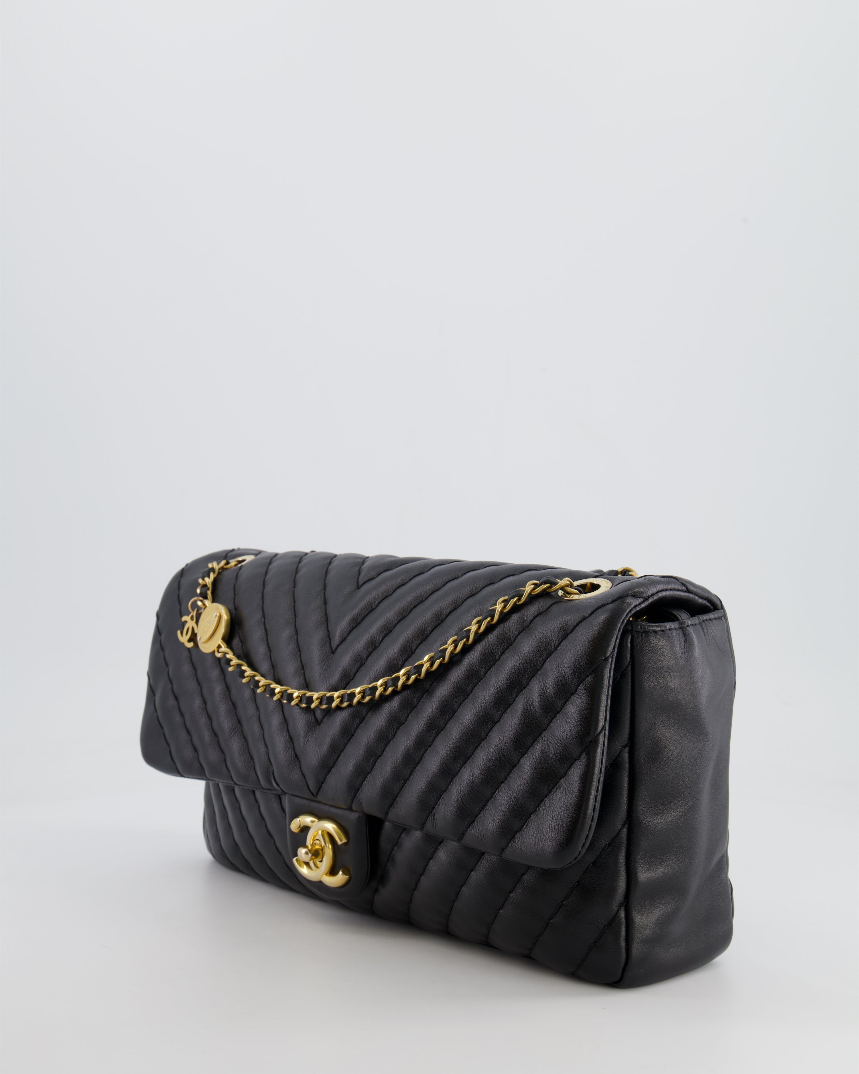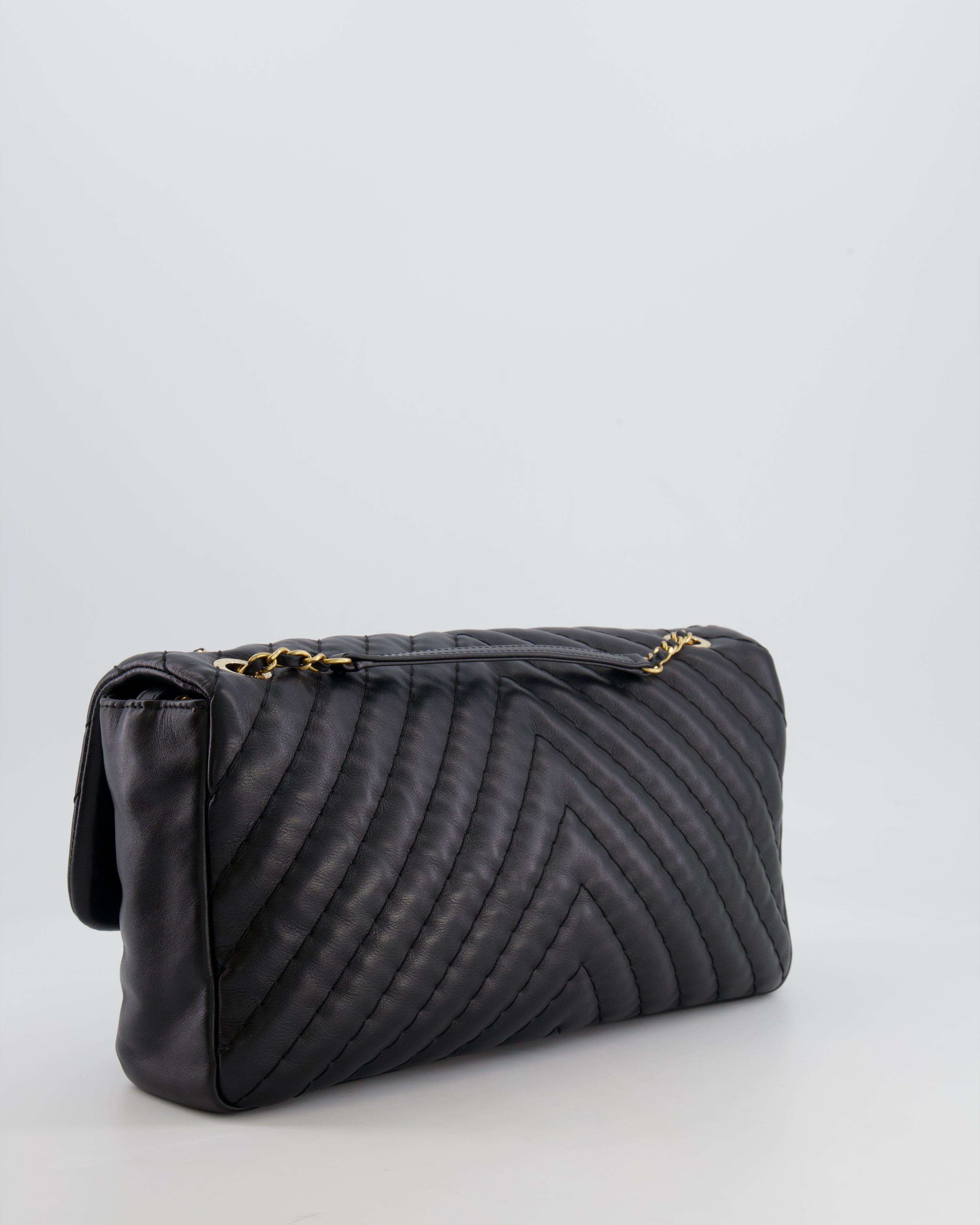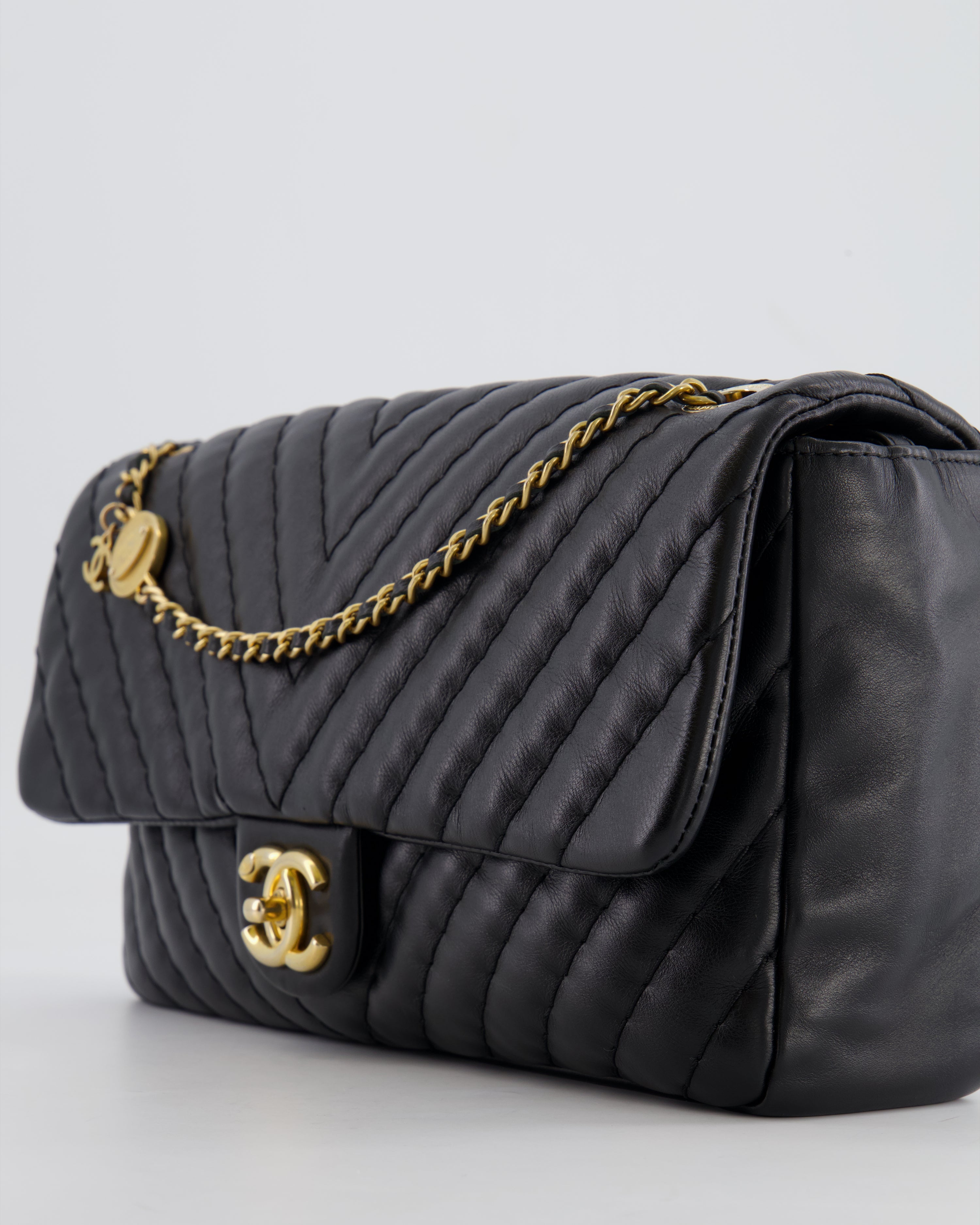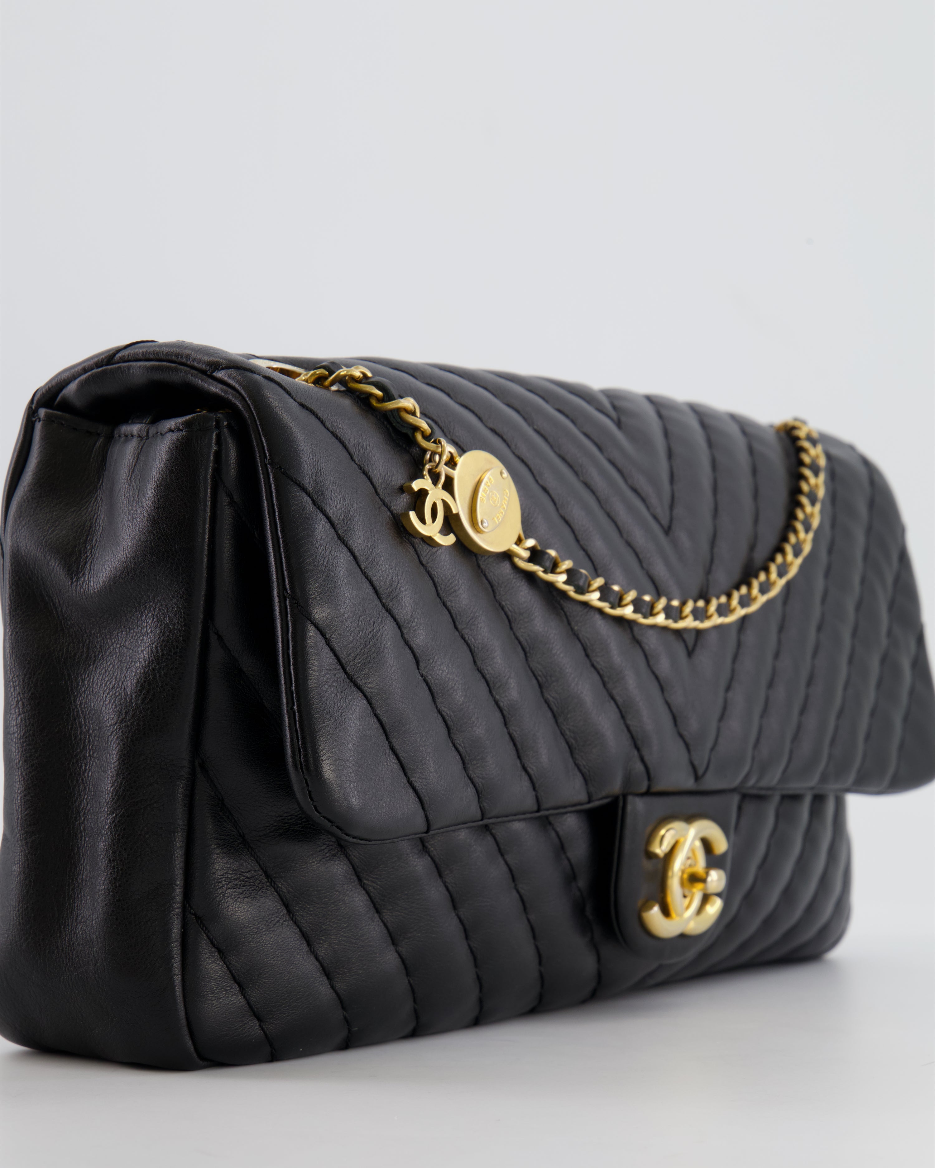 Chanel Black Large Single Flap Bag in Chevron Lambskin Leather with Gold Hardware and CC Medallion Detail