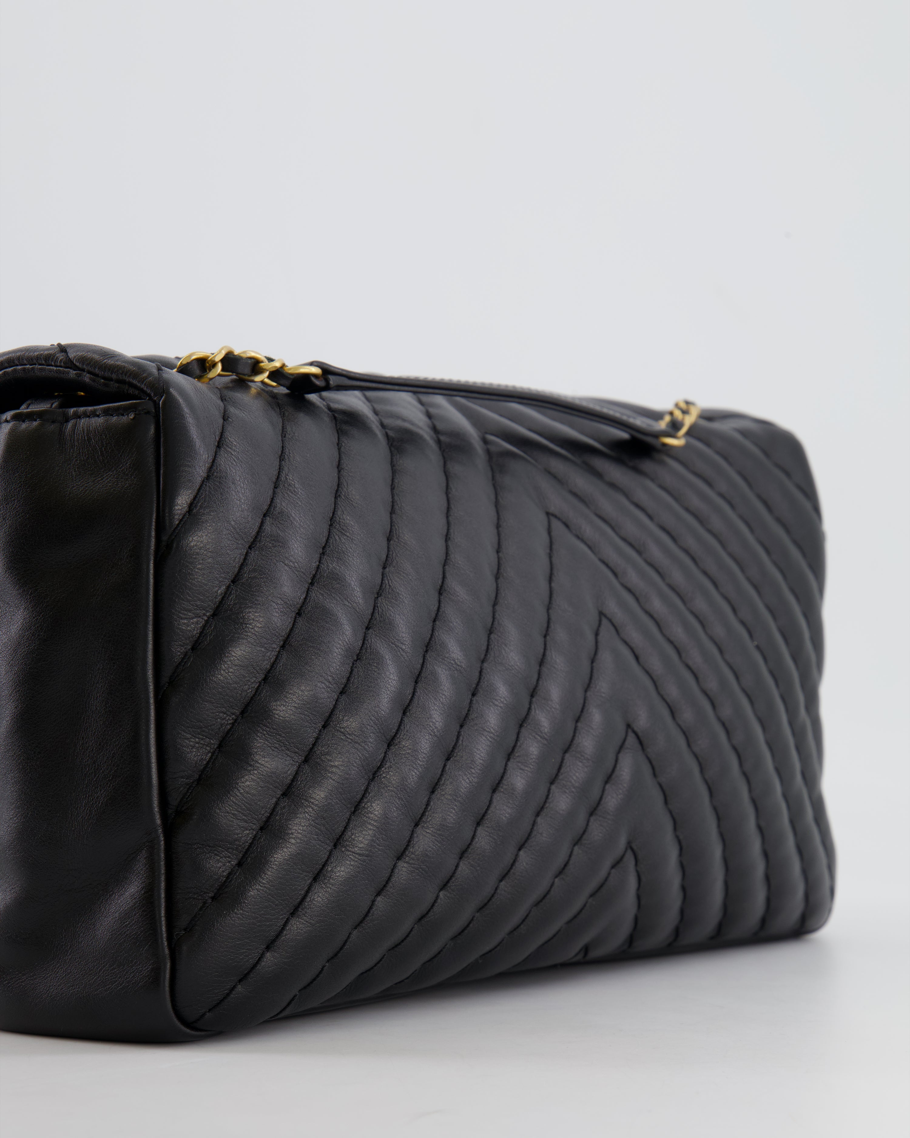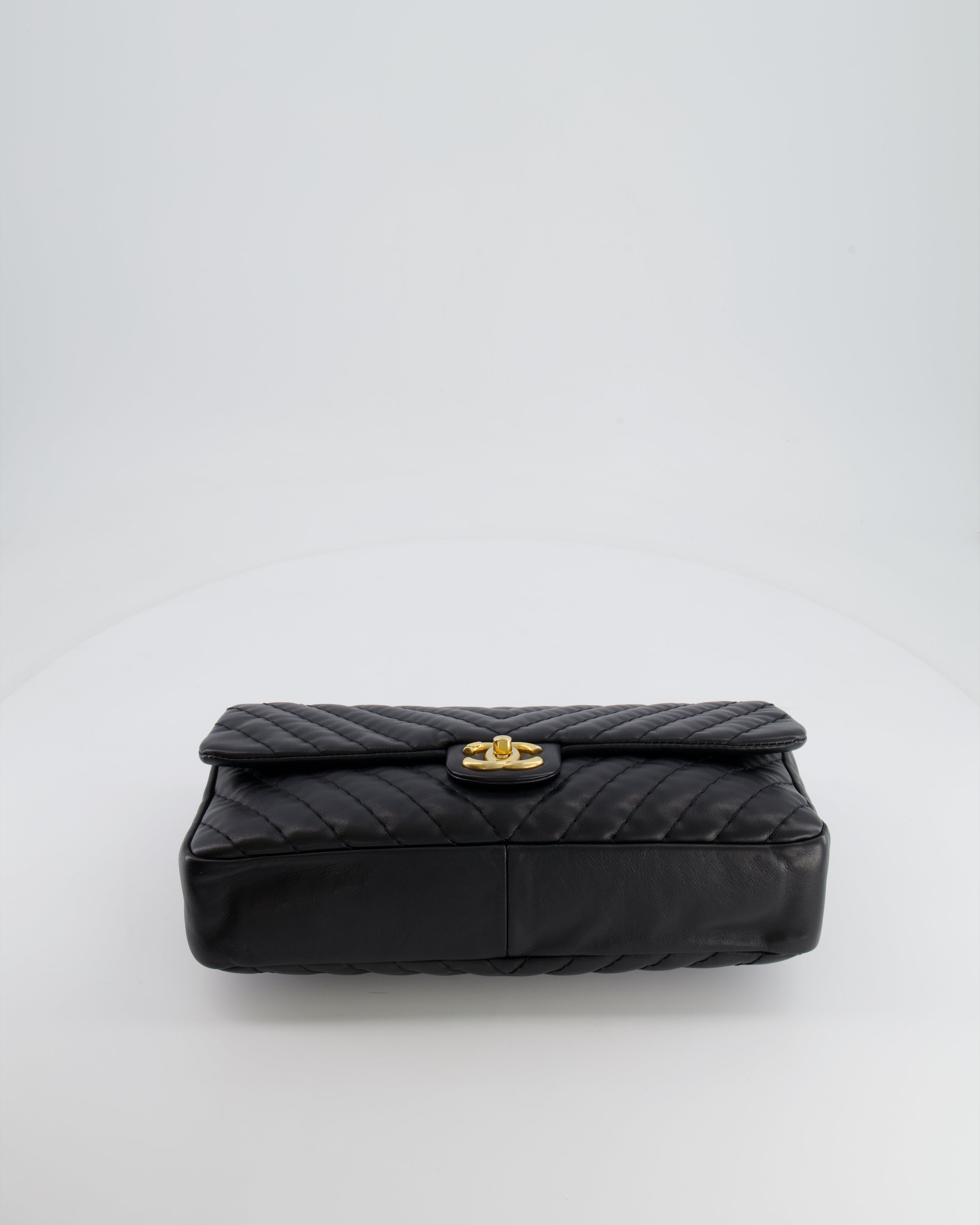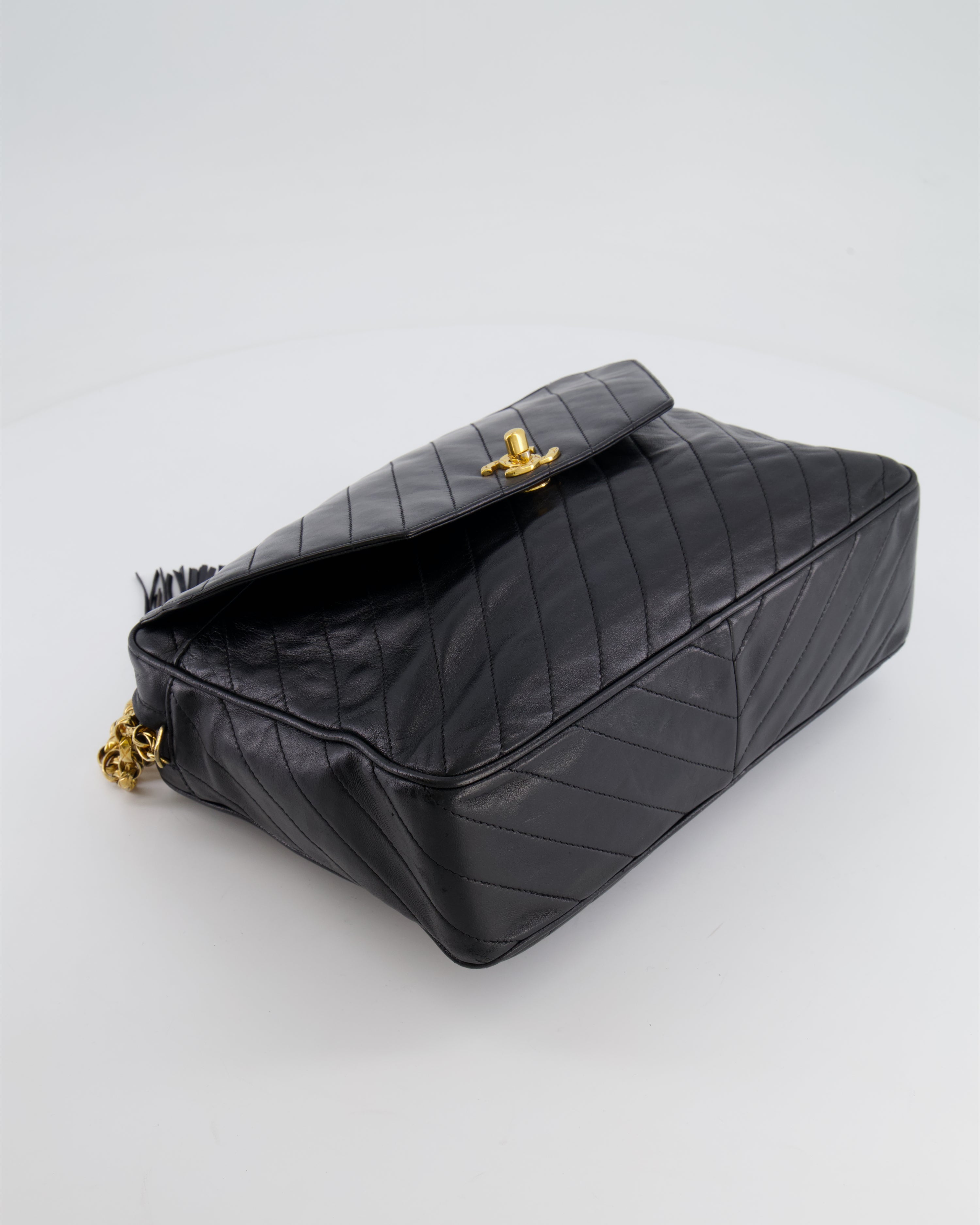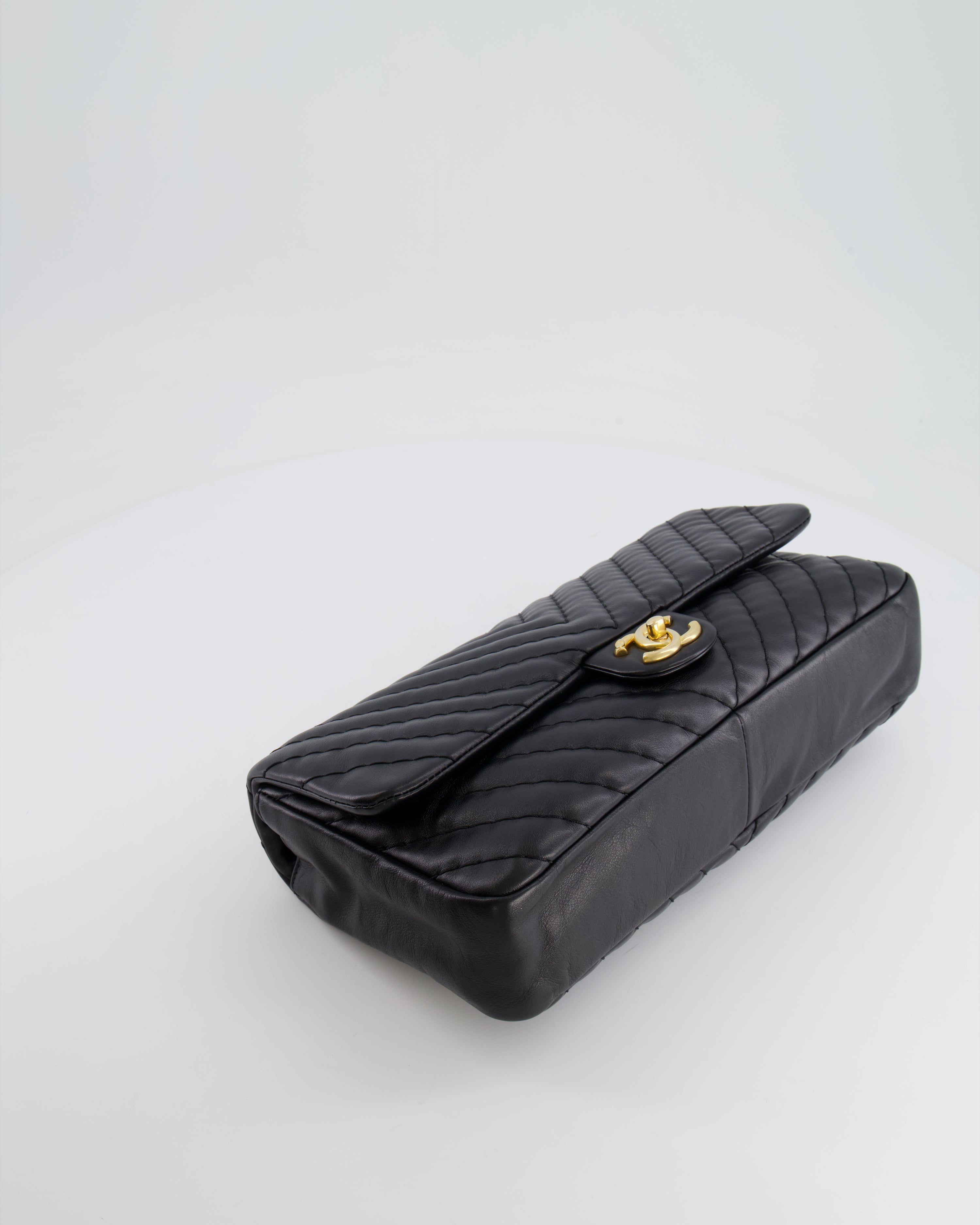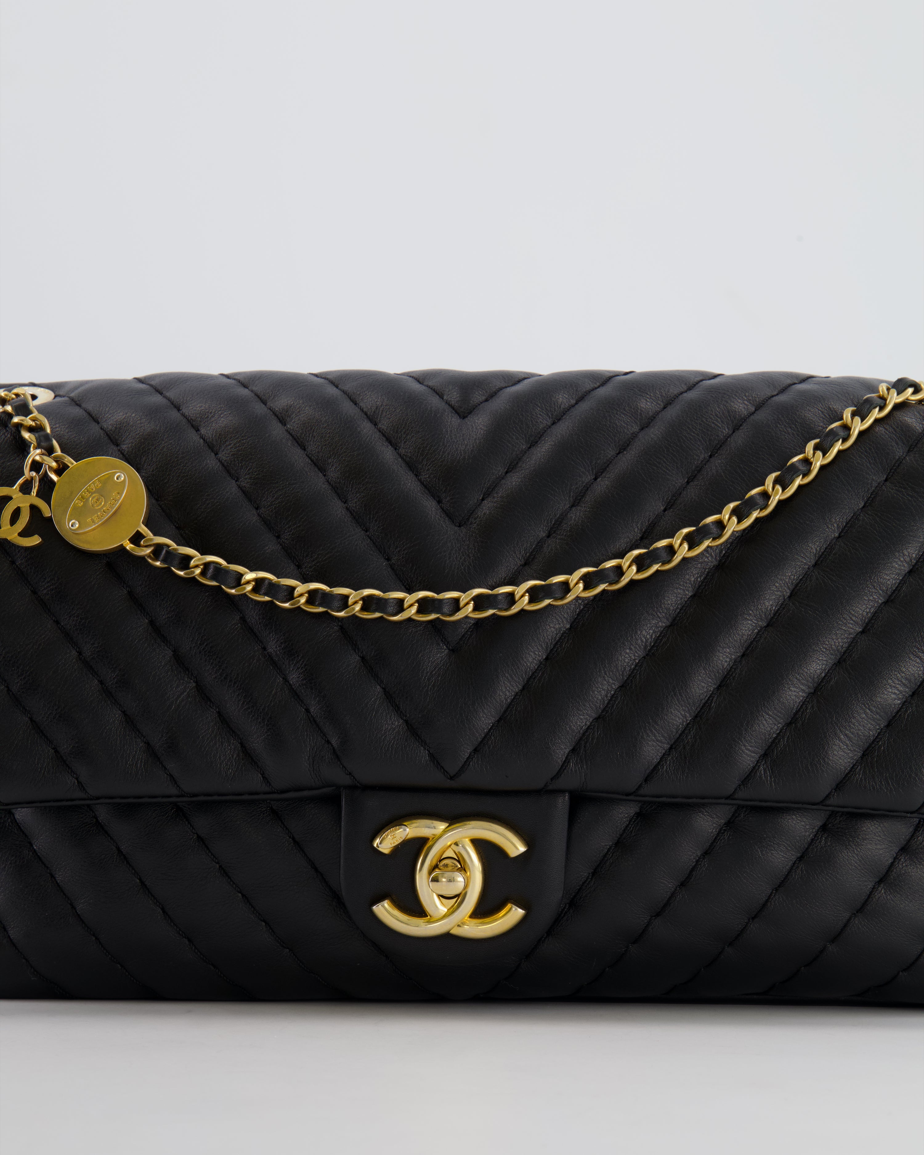 Chanel Black Large Single Flap Bag in Chevron Lambskin Leather with Gold Hardware and CC Medallion Detail