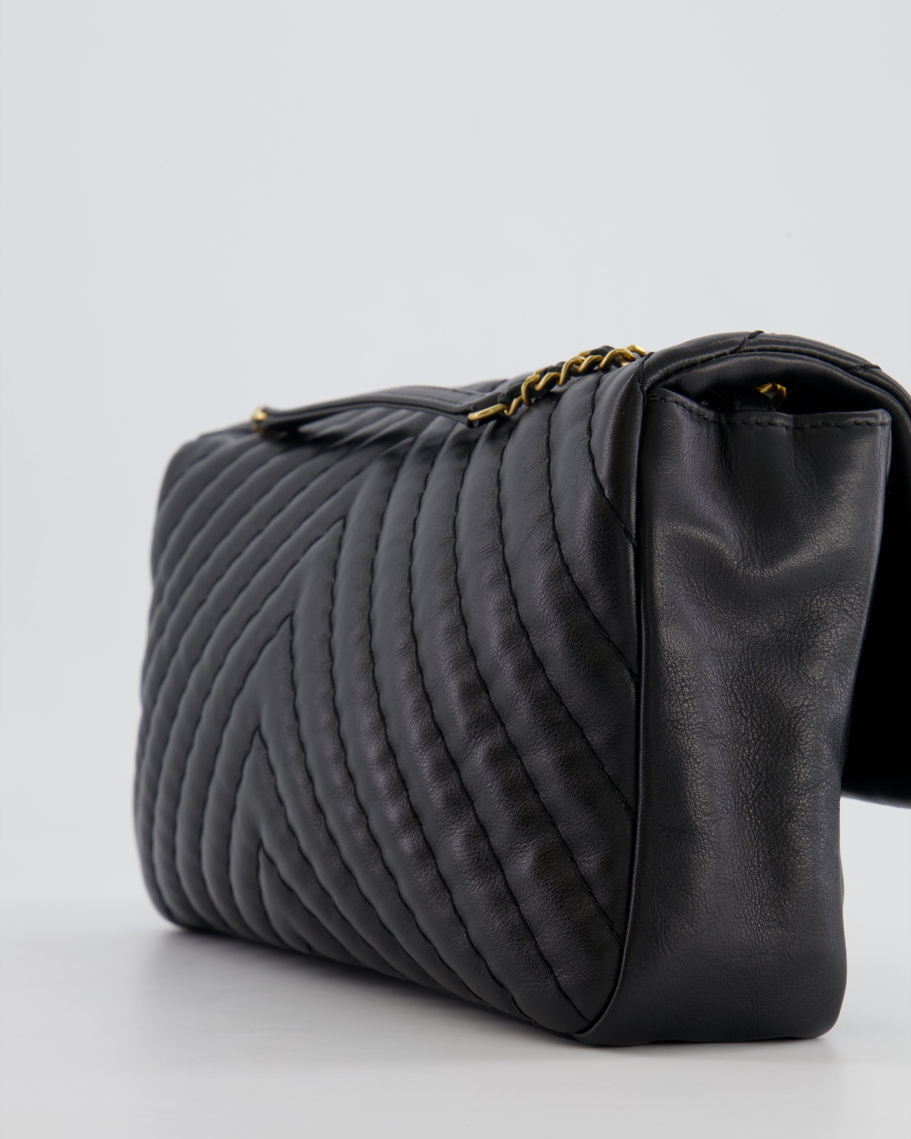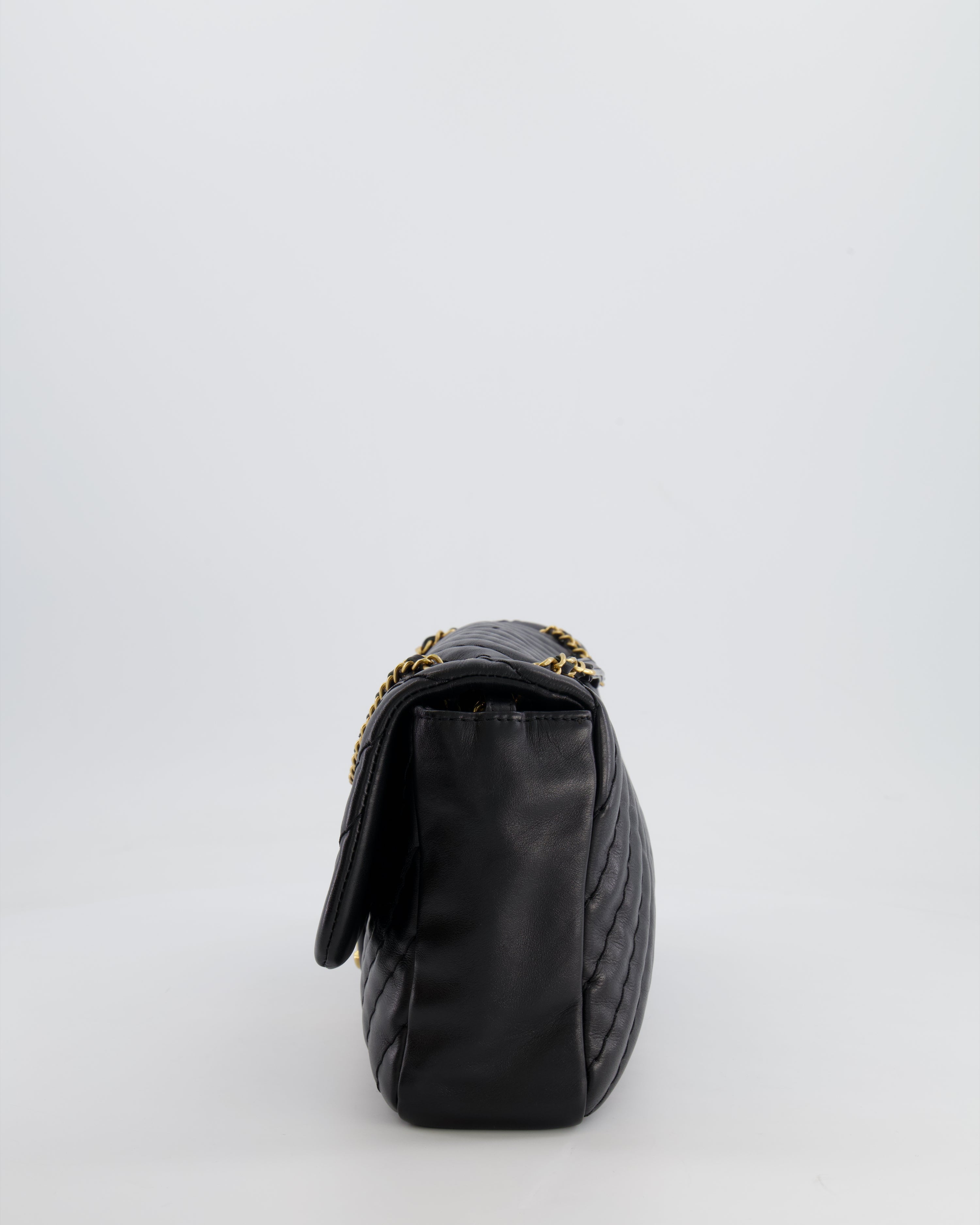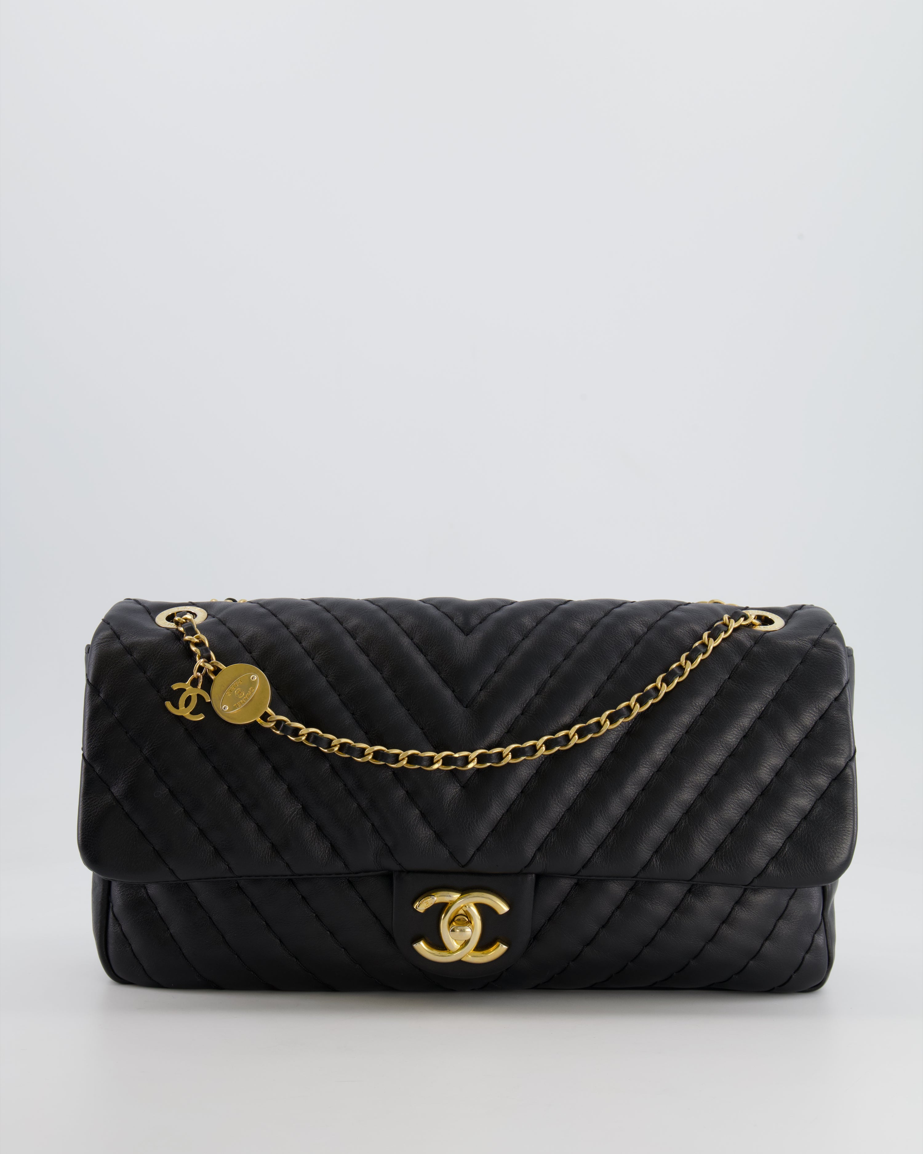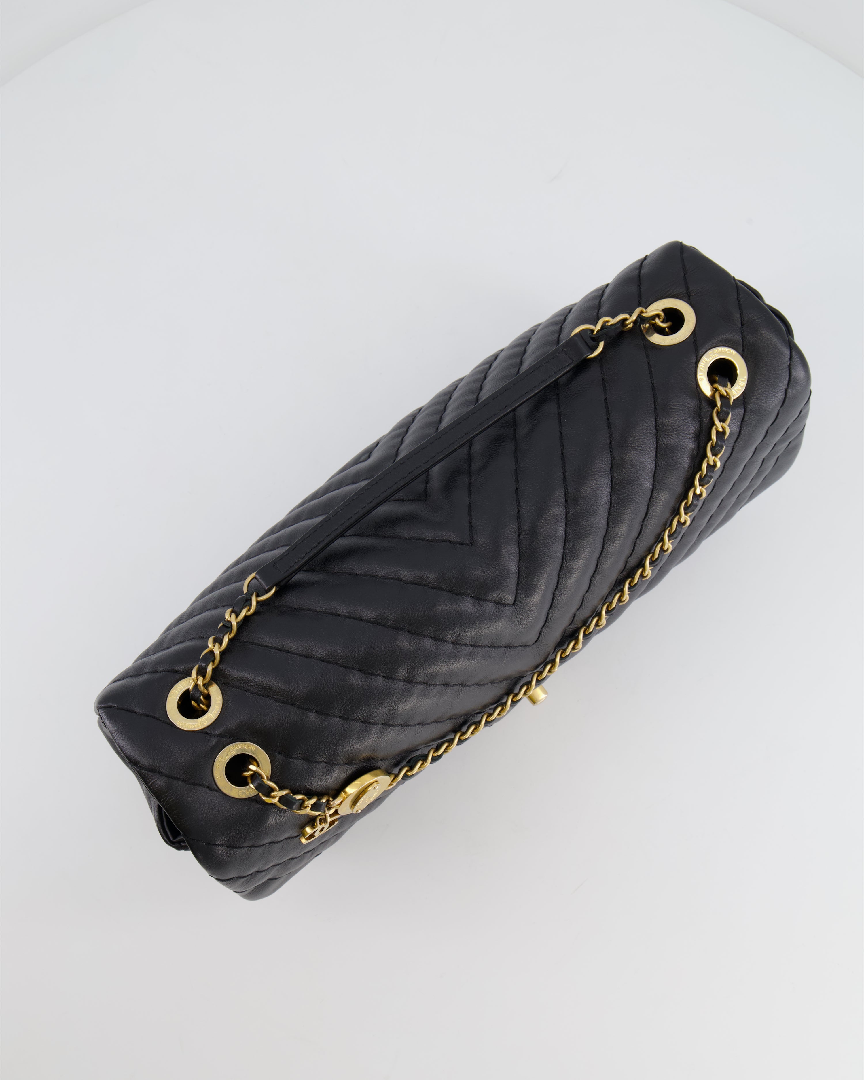 Chanel Black Large Single Flap Bag in Chevron Lambskin Leather with Gold Hardware and CC Medallion Detail