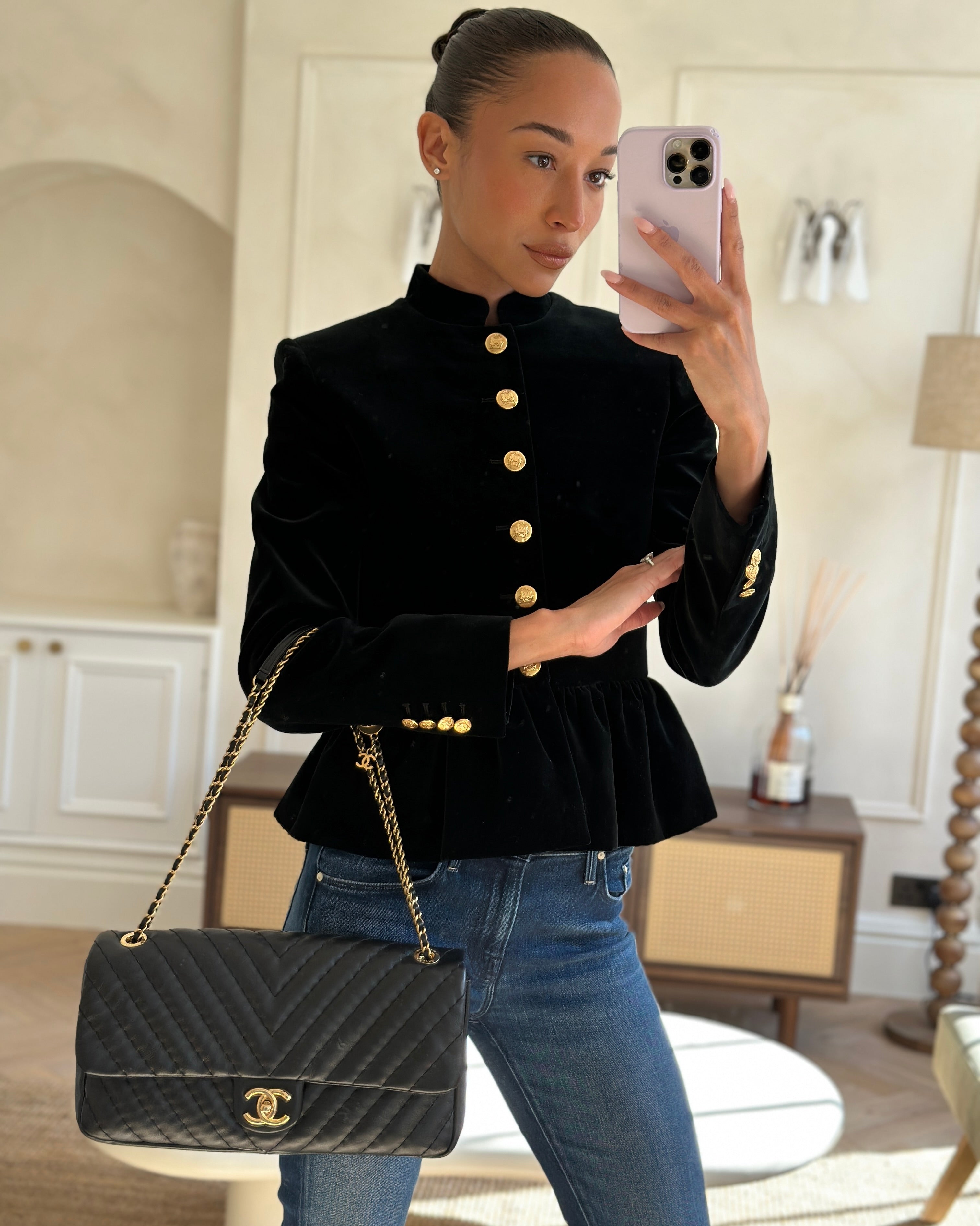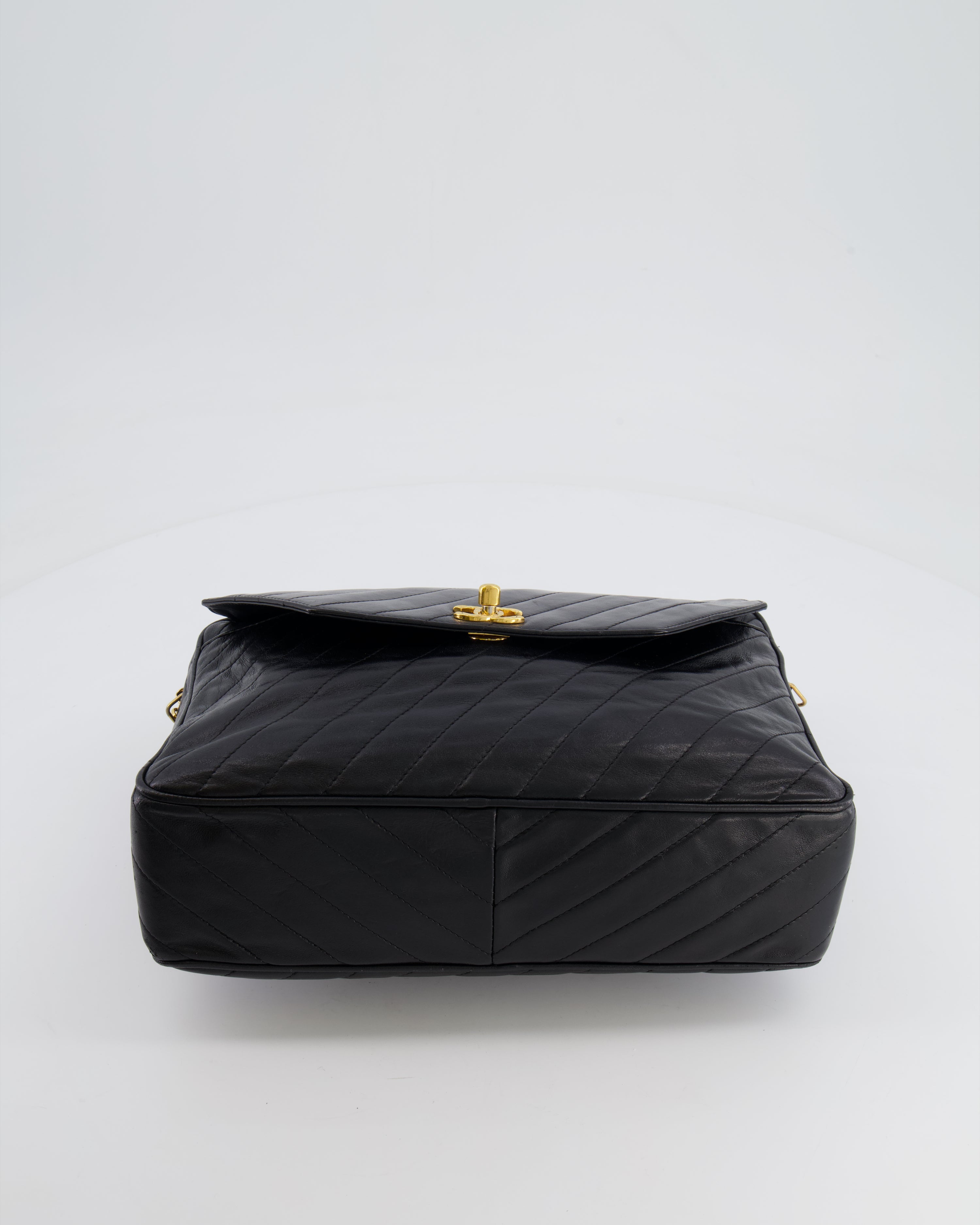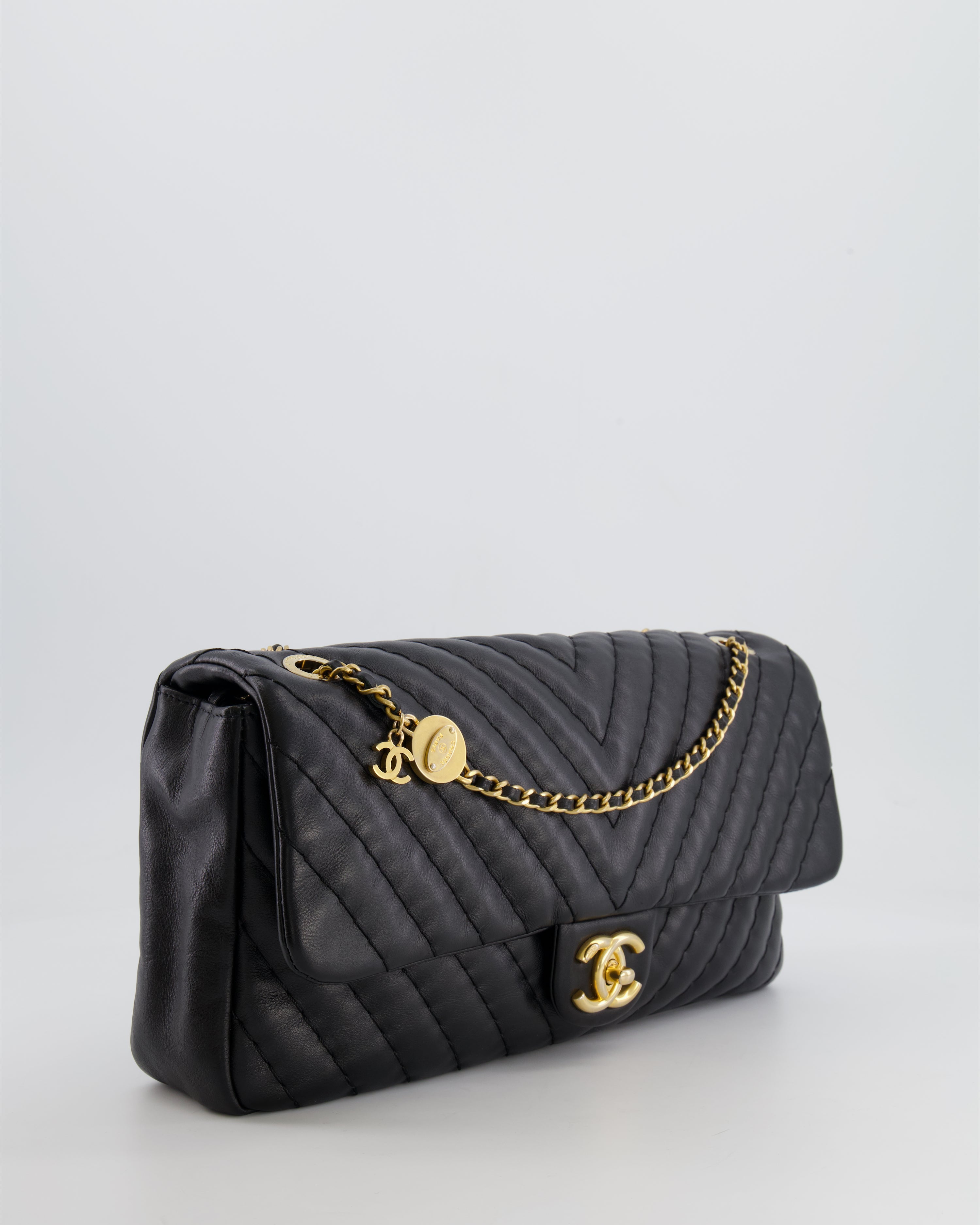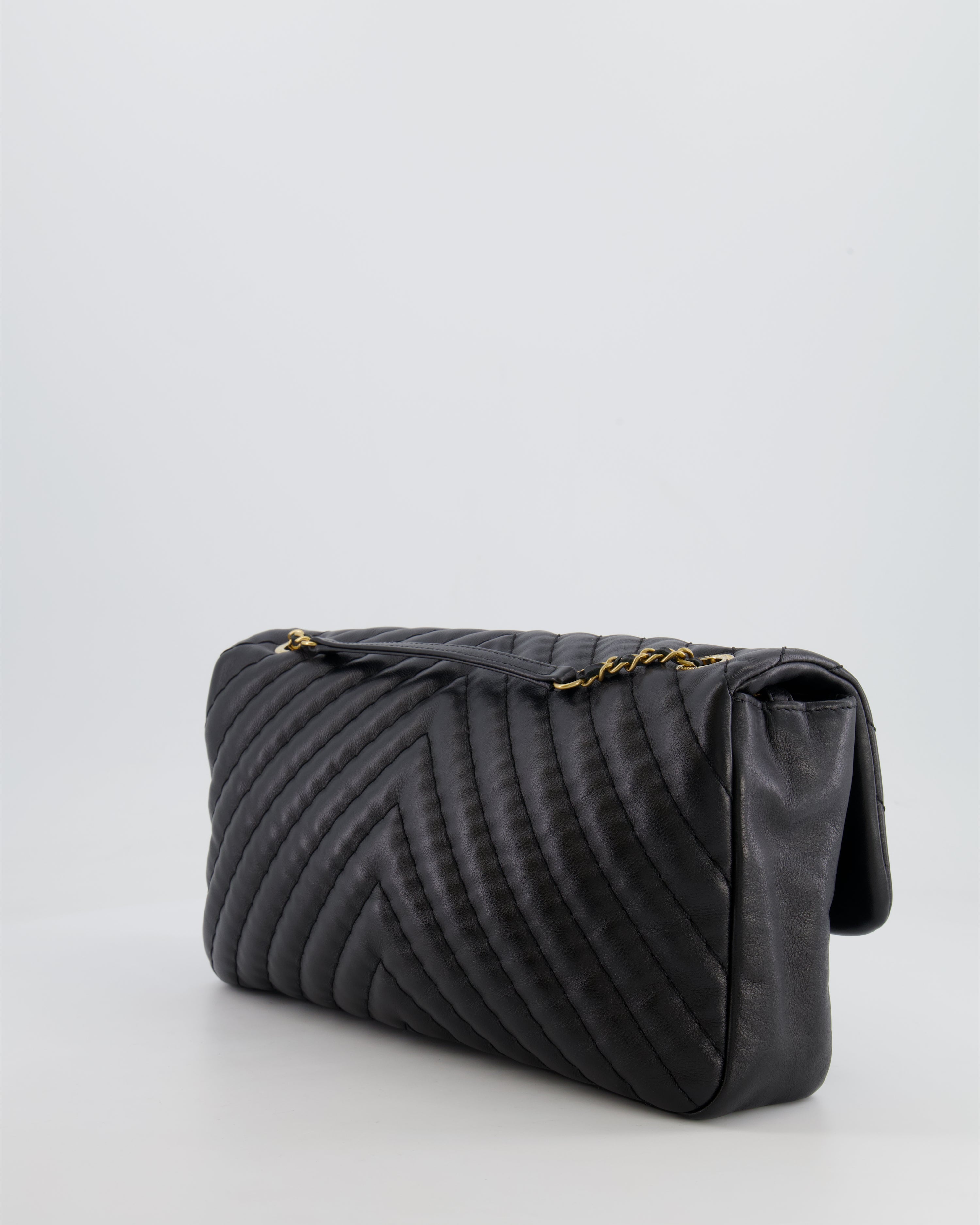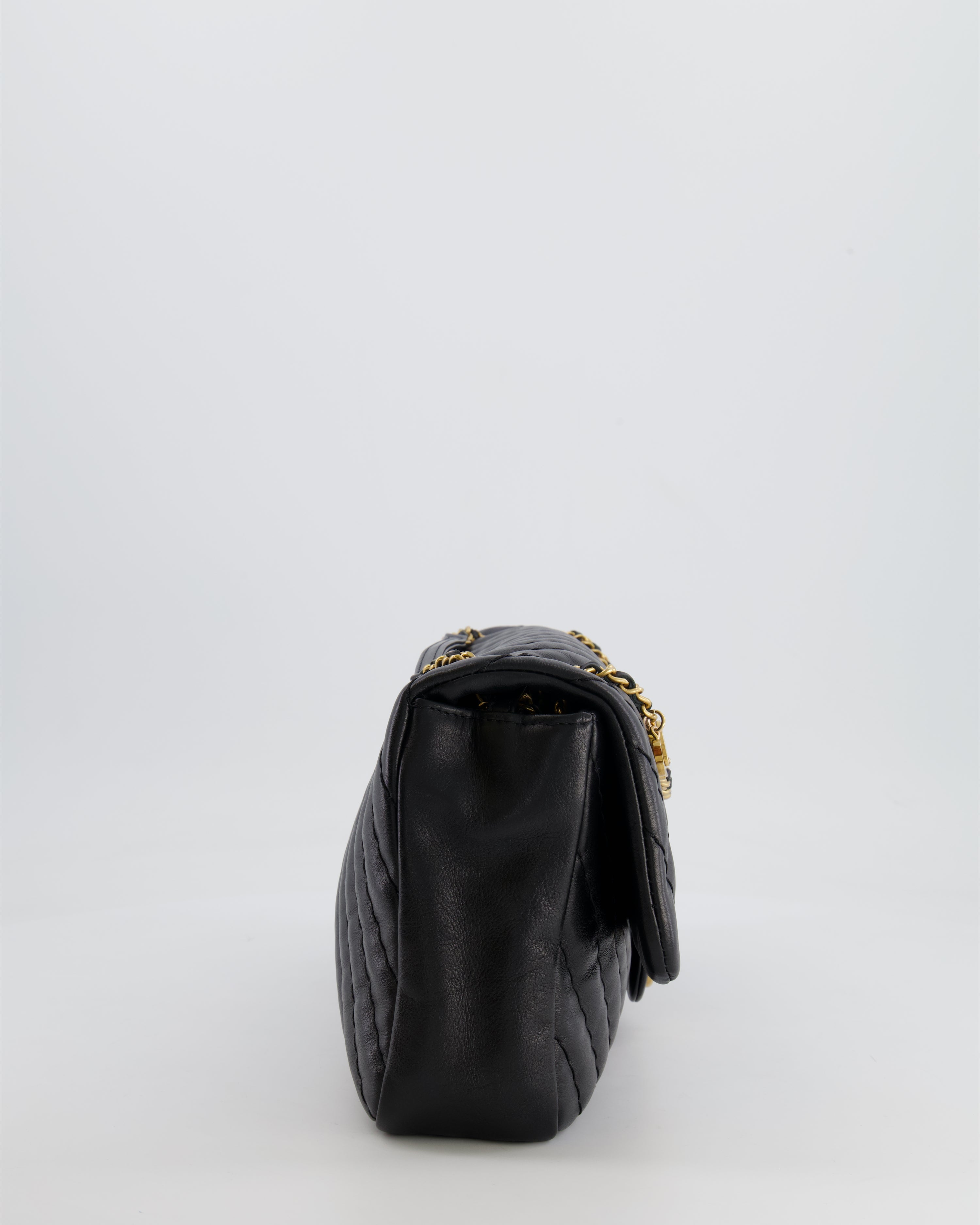 Chanel Black Large Single Flap Bag in Chevron Lambskin Leather with Gold Hardware and CC Medallion Detail