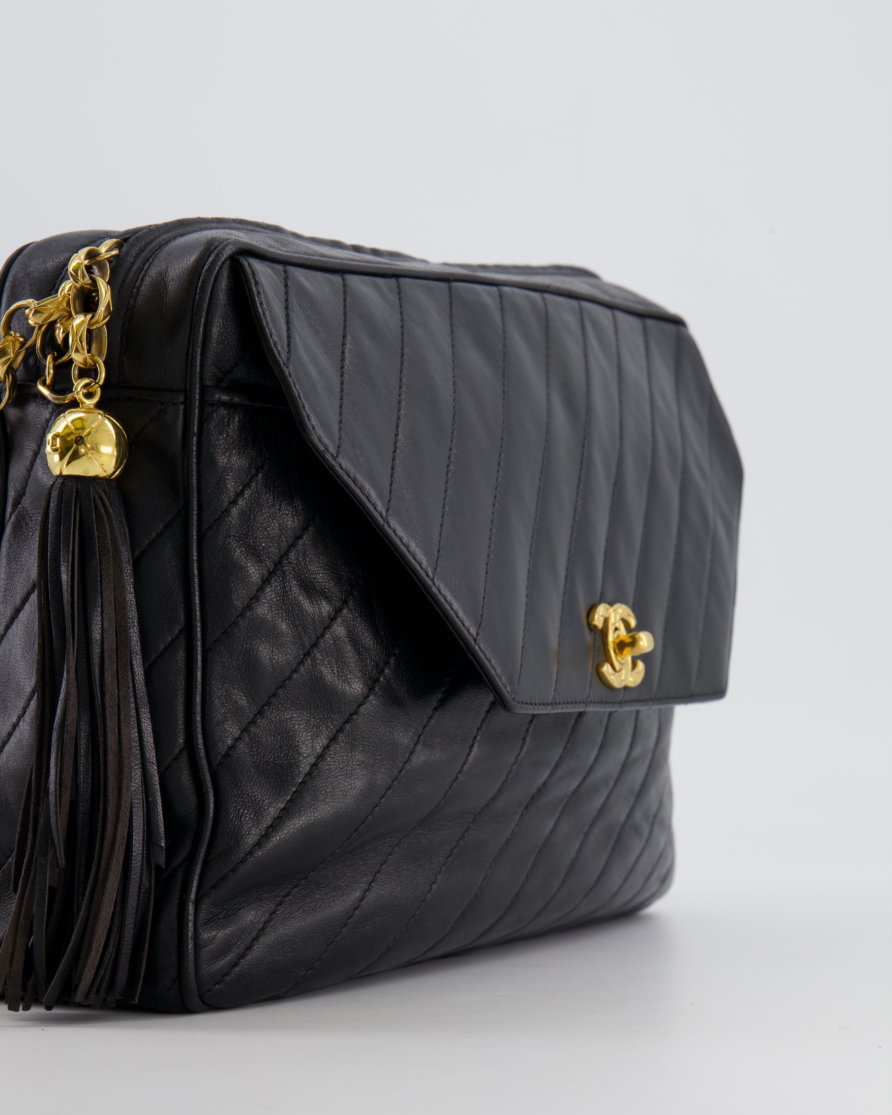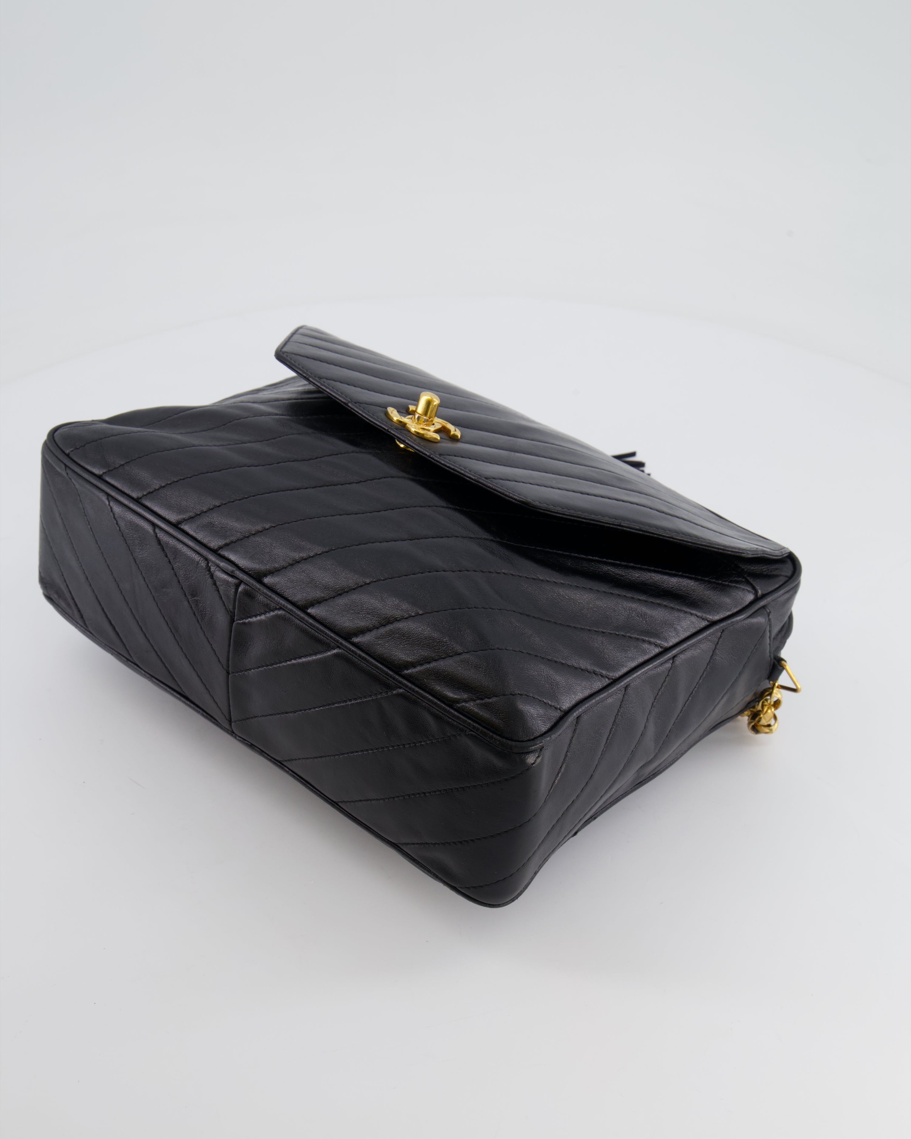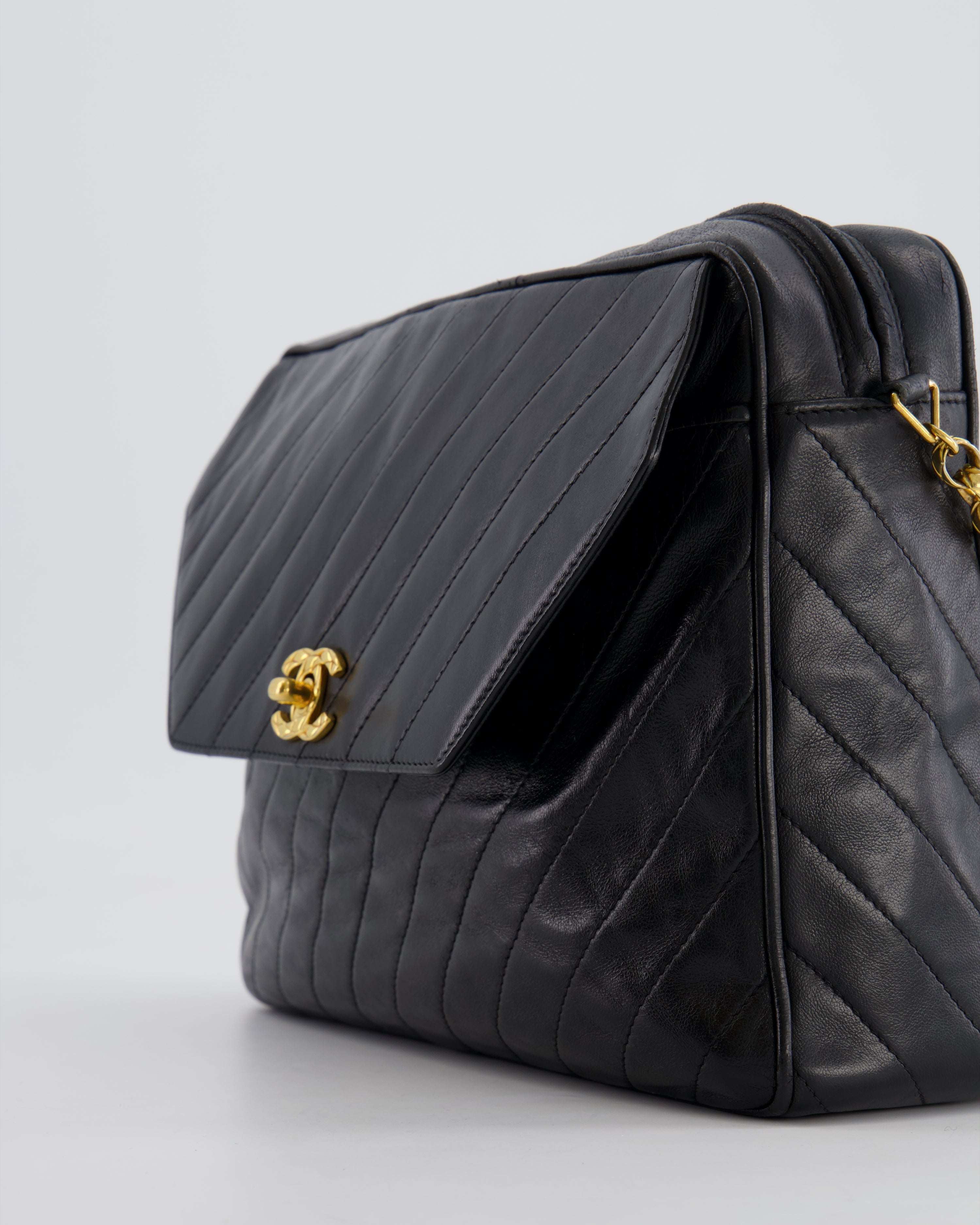 Chanel Vintage Black Large Camera Bag in Lambskin Leather with Front Pocket with 24k Gold Hardware